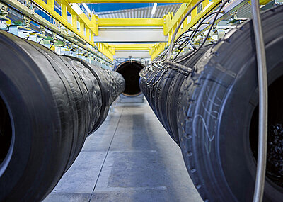 Da die Anschaffung von Reifen erhebliche Investitionen darstellt, sollte die Lebensdauer möglichst lang sein. Hier kommen die Runderneuerungswerke der Pneuhage-Gruppe ins Spiel: Die dort angewandte Technik erhält rund 80 % eines Lkw-Reifens und macht damit Runderneuerte zu einem echten Gewinner, wenn es um Nachhaltigkeit und Umweltschutz geht. Je nach Wertigkeit und Zustand können gebrauchte Reifen durch hochwertige Produktionsverfahren bis zu zwei Mal erneuert werden und somit ihre Nutzungsdauer deutlich erweitern. Das Ganze bedeutet in Zahlen: Pro runderneuertem Lkw-Reifen der Größe 315/80R22.5 können im Vergleich zur Neureifenproduktion bis zu 70 l Rohöl, 32 kg Gummi sowie 14 kg Stahl eingespart werden. Außerdem braucht der Prozess etwa 50 % weniger Energie und bis zu 80 % weniger Wasser – ein gewichtiges, ökologisches Argument, das für den Einsatz von runderneuerten Reifen auf Baustellen spricht.
