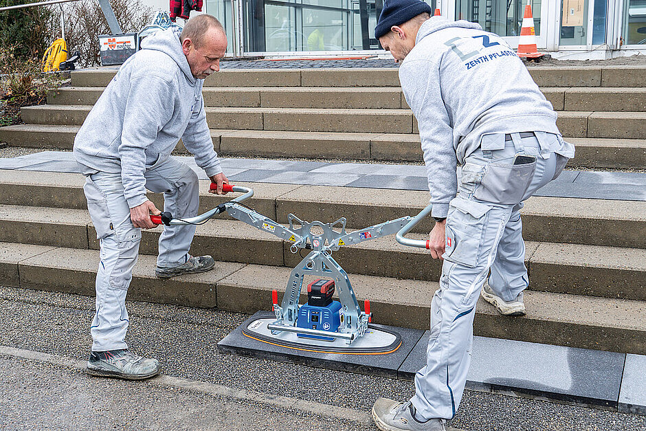 Ob Natursteinplatten, Betonplatten, Fliesen, Waschbetonplatten oder andere poröse Baustoffe: Der nur 16 kg leichte »M-Jet-250« hebt Elemente bis 250 kg zuverlässig und arbeitet dank 18 V/10-Ah-CAS-Akkutechnik komplett kabellos. Damit ist der »M-Jet-250« besonders flexibel einsetzbar und unabhängig von externen Stromquellen. Er lässt sich zudem ideal an unterschiedliche Baustellensituationen anpassen. Zwei Personen können das Gerät komfortabel über ergonomisch verstellbare Handgriffe bedienen. Eine kabelgebundene Fernbedienung ermöglicht es, das Vakuum direkt per Knopfdruck zu lösen. Alternativ kann der »M-Jet-250« über die integrierte Aufhängeöse auch an Baggern, Radladern oder anderen Trägergeräten eingesetzt werden. Dadurch ist der Vakuumheber sowohl im Handbetrieb als auch als Anbaugerät einsetzbar.