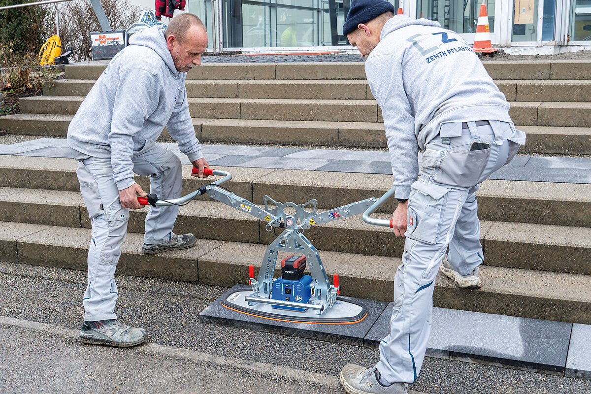 Ein wichtiger Vorteil des »M-Jet-250« ist das optional erhältliche Schnellwechselsystem für Saugplatten. Die Saugplatten lassen sich in kurzer Zeit ohne Werkzeug austauschen. Das System ist identisch mit dem des »Speedy VS«, sodass bereits vorhandene Saugplatten weiterhin genutzt werden können. Für den Baustellenalltag ebenfalls praktisch: Die umklappbaren Handgriffe ermöglichen eine stabile Parkposition, in der das Gerät sicher steht und die Saugplatte frei hängt. So bleibt die Saugfläche sauber, und die Dichtung wird geschont.