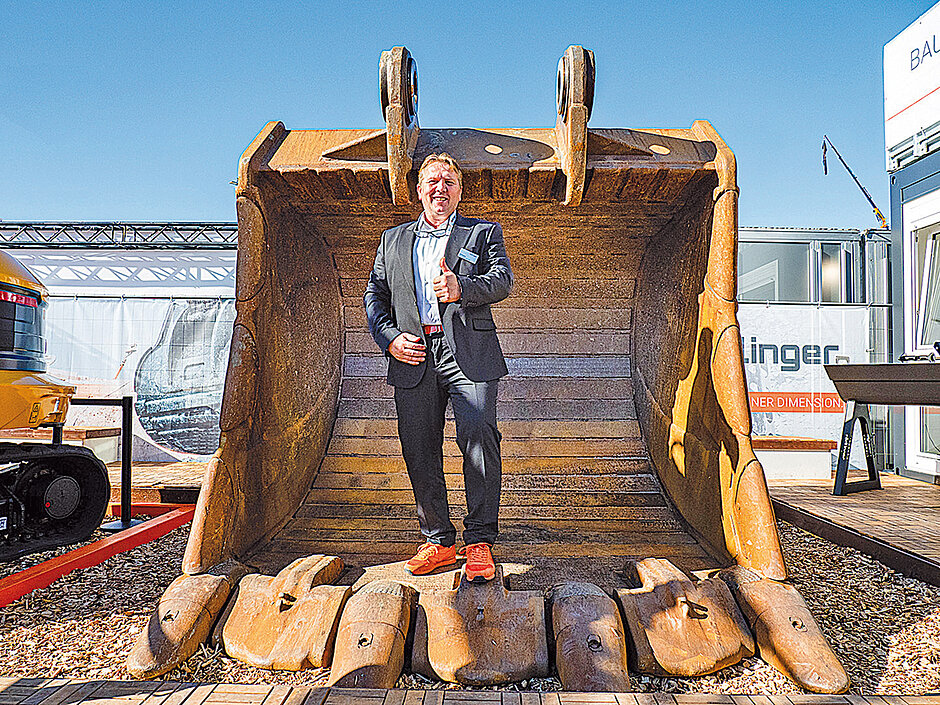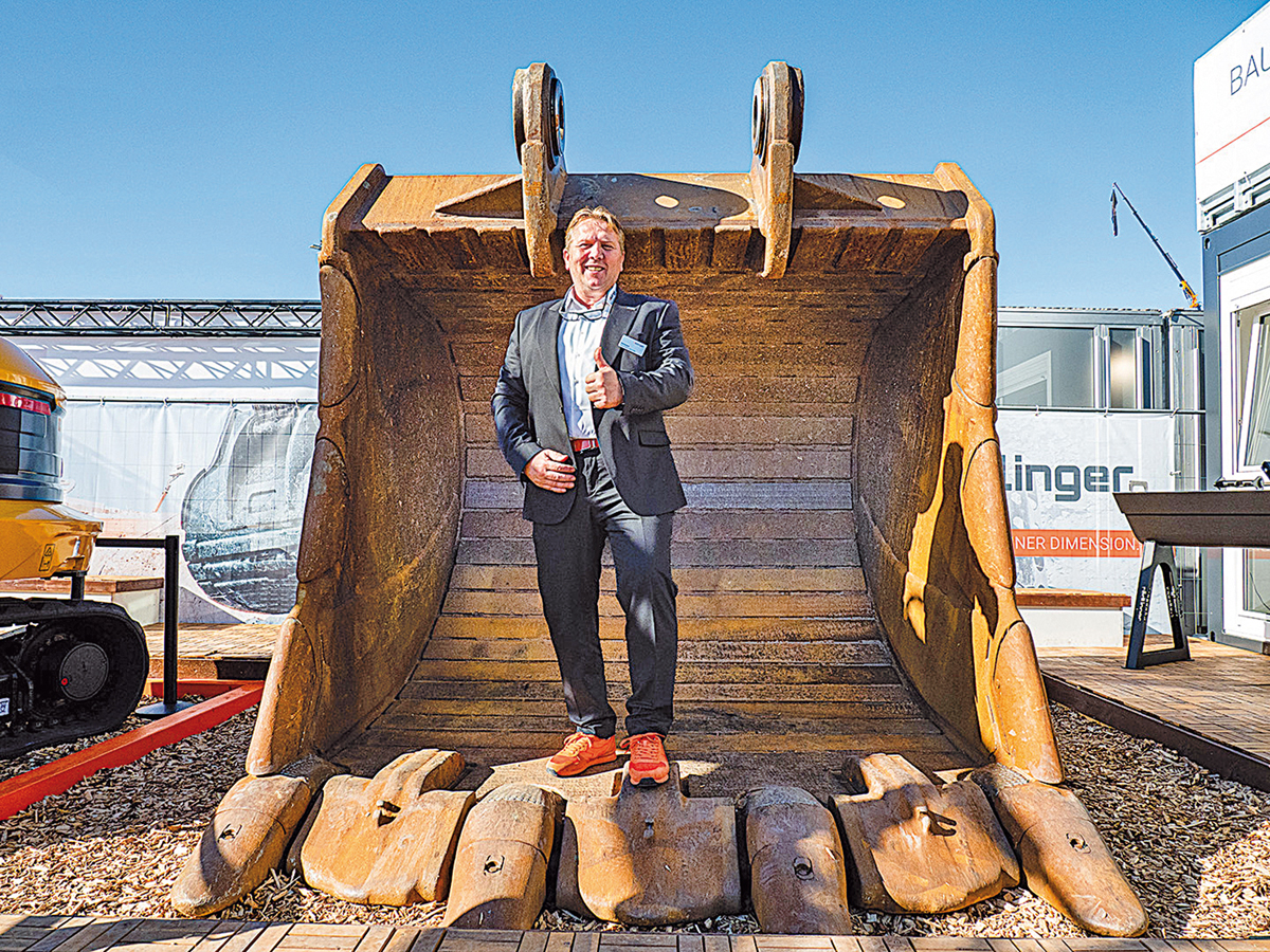 Den Blickfang am Außenstand nutzte Vertriebsleiter Nultsch für ein klassisches »Daumen hoch«-Signal zur Bauma 2022. Auch der Innenstand lockte Besucher mit der Vorstellung neuer Entwicklungen.