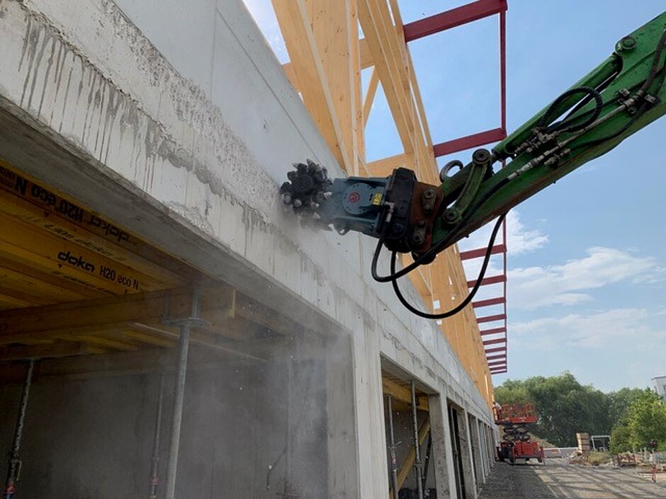Nur mit der Rockwheel Fräse kann das Material Zentimeter für Zenimeter abgetragen werden, sodass eine ebenmäßige Struktur hinterlassen wird. Im Bereich des Fassadenbaus ist eine ebenmäßige Struktur besonders wichtig, da die Verkleidung ansonsten nicht akkurat angebracht werden kann. Ist dies nicht gewährleistet, kann es zu undichten Stellen kommen und schlimmstenfalls temperatur- oder feuchtigkeitsbedingte Verformungen hervorrufen. Durch das Profilieren des Betons werden Ausbrüche und Unebenheiten an der Fassade vermieden, sodass direkt daran weitergearbeitet werden kann. Durch vibrationsarmes Arbeiten wird das Umfeld sowie der Bagger und sein Fahrer geschont und die umliegende Fassade nicht beschädigt.