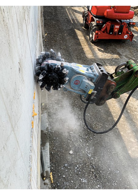 Maschinenführer Jochen Häberle war beeindruckt von der Genauigkeit der Rockwheel Fräse G5. Für Bagger mit 3 - 6 t bringt die Fräse eine optimale Leistung. 22 kW in Kombination mit einer 2:1 Getriebeübersetzung erzeugen maximales Drehmoment und ermöglichen müheloses Arbeiten, auch in sehr hartem Material. Die Schneidetechnik durch die optimale Meißelanordnung und Beschaffenheit ermöglicht Arbeiten ohne Ausbrüche, sodass die Wand ebenmäßig bearbeitet wird.