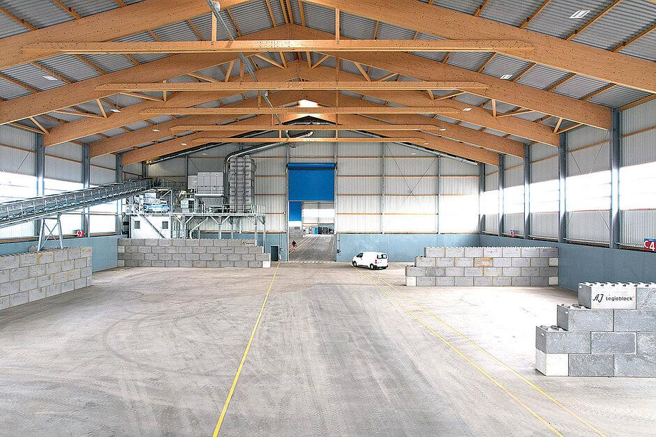 Neben der arbeitswirtschaftlichen Optimierung soll die Halle auch optisch punkten. Bei einem Blick ins Innere der Halle fällt die Stahl-Leimholzkonstruktion ins Auge, die bei Umschlaghallen eher selten zu finden ist. Die freitragende Leimholzkonstruktion gilt als eine der Spezialitäten von Hörmann. In der Halle werden mineralische Abfälle wie Boden, Bauschutt, Straßenaufbruch und Gleisschotter sowie Schüttgüter, wie Sand, Kies und Schotter, zwischengelagert und für die Lkw-, Bahn- und Schiffverladung umgeschlagen. Die Stoffe werden sortiert, bearbeitet und dann wieder herausgefahren. Für diesen Prozess sind neben ausreichend Platz und Höhe auch Boxen ohne Stützen und Schüttgutwände aus Stahl erforderlich.