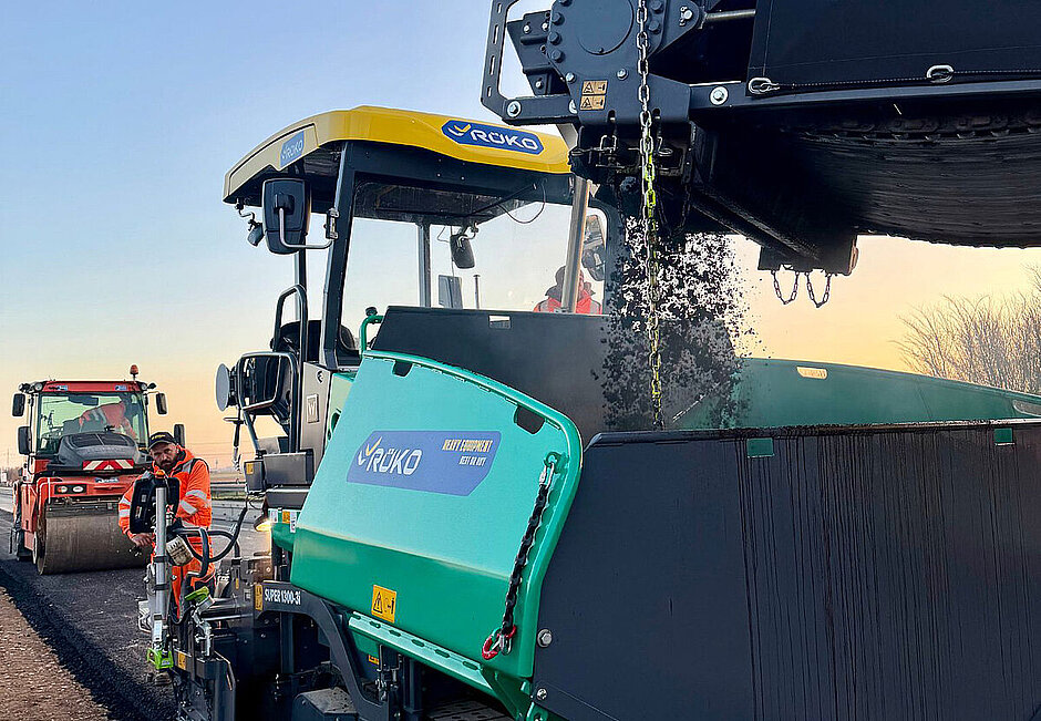 Für den Einbau der Asphalttragschicht setzte das Bauunternehmen einen bei Rüko angemieteten Straßenfertiger vom Typ Vögele Super 1300-3i ein. Innerhalb von vier Arbeitstagen wurden rund 4000 t Asphalttragschicht eingebaut. Um diese Leistung unter den beengten Platzverhältnissen zu gewährleisten, entwickelte das Werkstattteam von RÜKO eine projektspezifische Lösung: Eine eigens konstruierte „vordere Bunkerwand“ wurde am Materialbunker des Fertigers montiert und vergrößerte das Fassungsvermögen für das Mischgut. Auf diese Weise konnte das Material direkt über einen Beschicker in die Maschine transportiert werden. Unter normalen Umständen wäre für diese Arbeitsweise ein größerer Fertiger mit Asphaltkübel erforderlich gewesen. Aufgrund der beengten Baustellensituation und der geringen Einbaubreite war dies jedoch nicht möglich: Der nächstgrößere Fertiger hätte