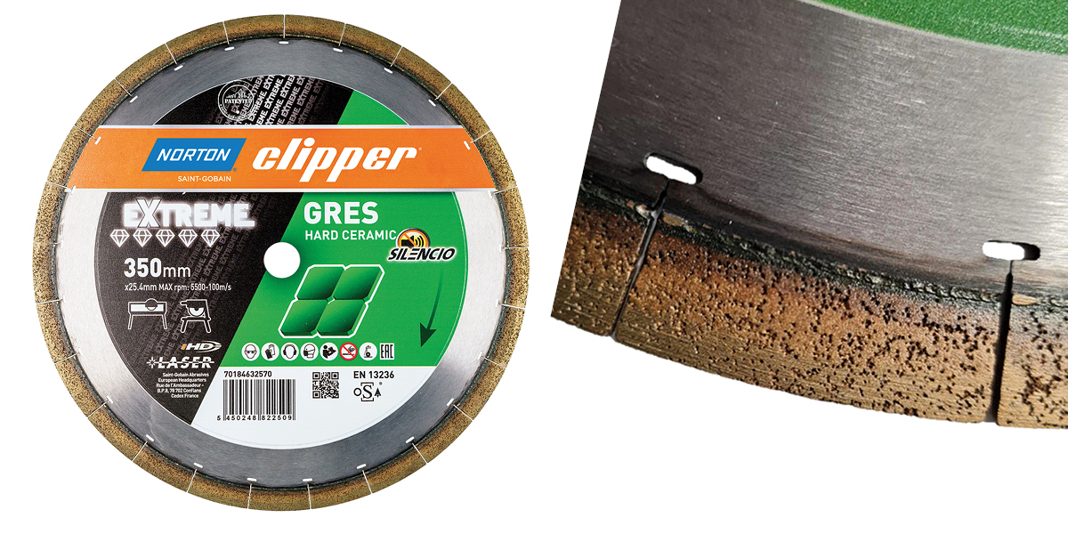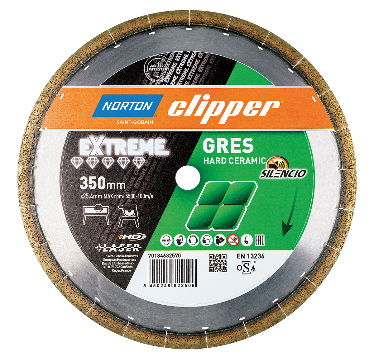 Damit sehr hartes und dickes Feinsteinzeug sicher und auch ohne hohe Rüstkosten getrennt werden kann, hat Norton Clipper die Extreme Gres Diamantscheibe entwickelt. Ihre 15 mm hohen, lasergeschweißten Segmente werden auf Basis der von Norton weiterentwickelten und patentierten iHD-Technologie hergestellt, welche Porosität in die Segmente bringt. Dank dieses Verfahrens trennt die Norton Clipper Extreme Gres Diamantscheibe extrem schnell bei unerreicht hoher Standzeit.