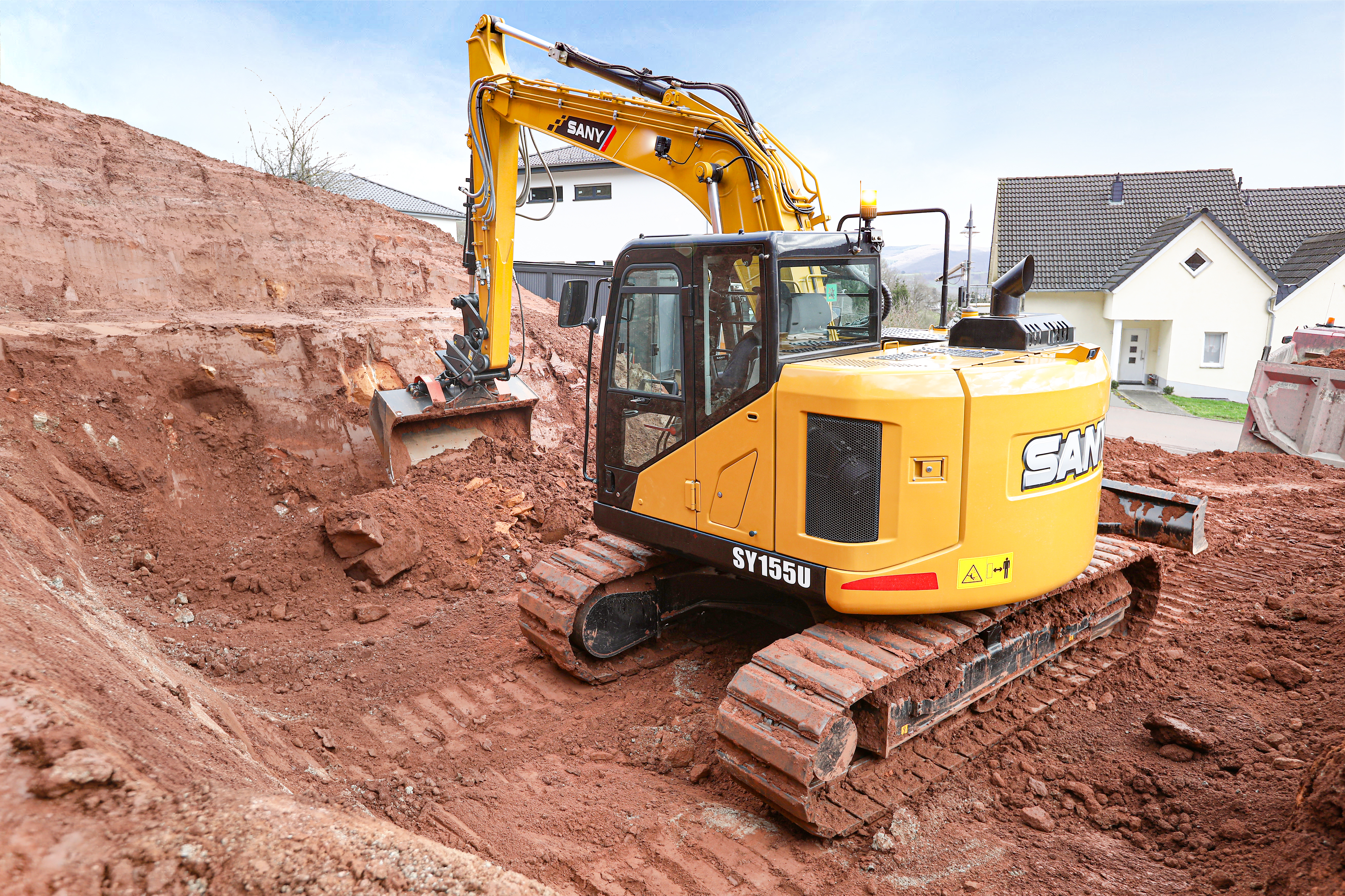 Auch der Kompaktbagger SY155U ist jetzt noch umweltschonender auf den Baustellen Europas unterwegs. Die Kurzheckmaschine wird bevorzugt im Erdbau, zu Ladetätigkeiten und im Straßenbau eingesetzt. Dafür ist er perfekt konstruiert, denn durch das kurze Heck benötigt er wenig Raum, um seine volle Leistung standsicher auszunutzen.