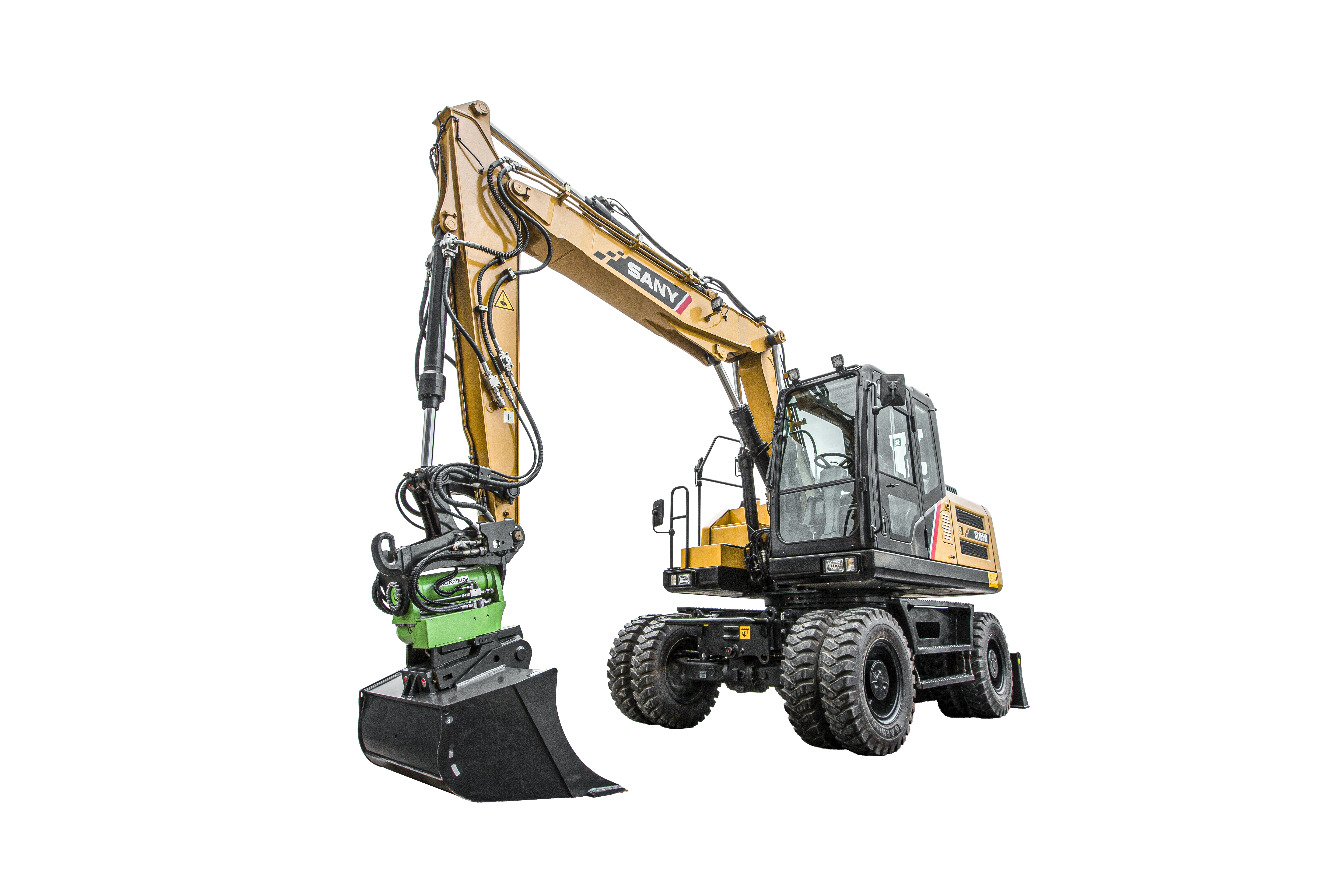 Der 15-t-Mobilbagger überzeugt im Tiefbau, auf Stadtbaustellen oder im GaLa-Bau durch Flexibilität – auf Rädern. Der große Vorteil: Kurze Strecken von einer Baustelle zur nächsten lassen sich problemlos überbrücken. Bewährt hat sich auch die Hydraulikanlage. Sie umfasst beispielsweise die Umschaltung vom Stiel auf den Löffelzylinder, die Vorbereitung des Schnellwechslers und die beiden zusätzlichen Hydraulikkreisläufe. Speziell für europäische Anforderungen hat SANY den Arm als Verstellausleger umgesetzt.
