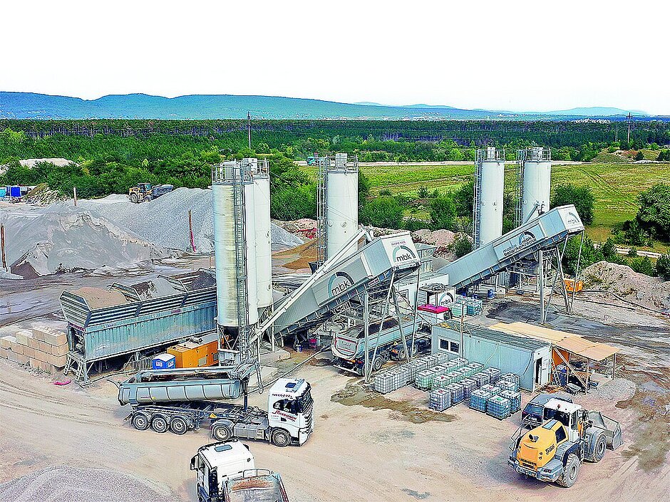 Das zahlt sich auch bei der Erneuerung der A2 aus: Ohne weitere Nachbehandlung wandern die Recyclingkörnungen in die beiden mobilen Betonmischanlagen SBM »Euromix 3000« der Mobile Betonkonzepte GmbH (MBK). Keine 200 m beträgt dieses entscheidende Teilstück im Baustoff-Kreislauf: Direkt ab Zwischenhalde wird das RC-Gestein per Radlader in die Gesteinsbunker der beiden unmittelbar nebeneinander positionierten Mischanlagen verladen. Über die knapp 16-monatige Bauzeit liefern beide 130-m³/h-Anlagen in vier jeweils rund einmonatigen Kampagnen insgesamt 75 000 m³ Unterbeton mit einem Recycling-Anteil von 90 Prozent sowie weitere 15 000 m³ Oberbeton auf Hartsteinbasis. Beide Anlagen arbeiten unabhängig, was die parallele Bereitstellung beider Betonsorten gewährleistet, je nach Baustellenplanung jedoch auch die flexible Abdeckung von Bedarfsspitzen ermöglicht. Mittels einer 90°-Aufstellung der beiden Gesteinsbunker, der flexibel neben bzw. hinter den Mischereinheiten platzierten 69-m³-Bindemittelsilos sowie der gemeinsam genutzten Zusatzmittellager bzw. Steuerungscontainer für beide »Euromix«-Anlagen beansprucht die Kombination laut Unternehmen nur wenig Platz. Das sorge auch bei Spitzenauslastung für eine zuverlässige Beschickung der Gesteinsbunker und eine schnelle sowie sichere Verladung der unterschiedlichen Betonsorten auf Muldenauflieger bzw. Fahrmischer. Die modulare Zusammenstellung aller Komponenten ermöglichte den betriebsbereiten Aufbau der Gesamtanlage mit lediglich fünf Mobilfundamenten für die Bindemittelsilos in nur anderthalb Arbeitstagen. Auch der tägliche Betrieb gestaltet sich aufgrund weitgehender automatisierter Prozesse sehr rationell: Ganztägig lieferbereit, produzieren drei Mitarbeiter hauptsächlich nachts die benötigten Einbaumengen, wobei die durchschnittliche Produktion pro 12-Stunden-Schicht bei rund 1 500 m³ liegt. Insgesamt 18 »Euromix«-Mischanlagen mit Stundenleistungen von 80 bis 175 m³/h Festbeton und eine Vielzahl projektspezifisch kombinierbarer SBM-Technikmodule bilden heute den kurzfristig abrufbaren Anlagenpark der deutsch-österreichischen MBK.d