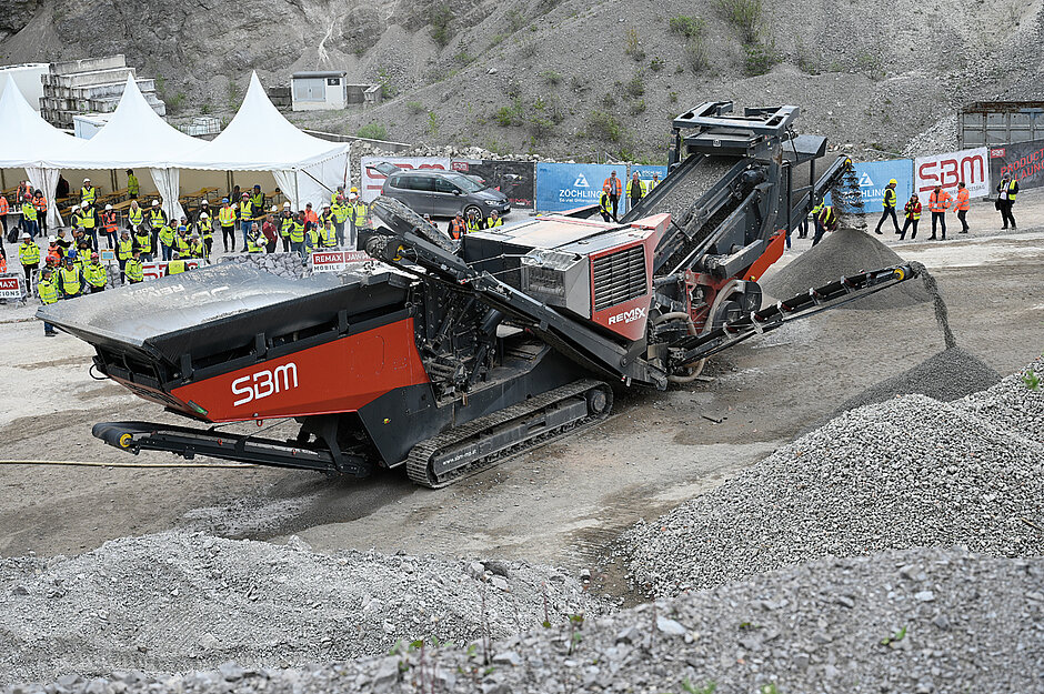 Ein typischer Produkt-Launch beginnt für gewöhnlich damit, einer kurzweiligen Ansprache zu lauschen, in der Hochglanzbroschüre zu blättern und anschließend in Fachgespräche zu versinken. Stattdessen hat SBM Mineral kurzerhand einen ganzen Felsabschnitt weggesprengt. Oberhalb eines weitläufigen Plateaus, und damit in sicherer Entfernung zur eigentlichen Produktvorführung, sorgten die Sprengmeister des Steinbruchs für ein gehöriges Scheppern. Einher ging der Startschuss für die Vorführung der Remax 600 also mit einem lauten Knall, aufgewirbeltem Staub und vielen umherfliegenden Felsbrocken.