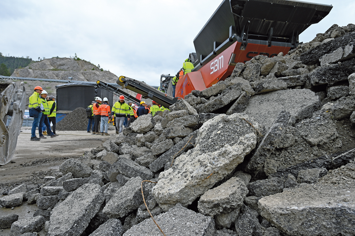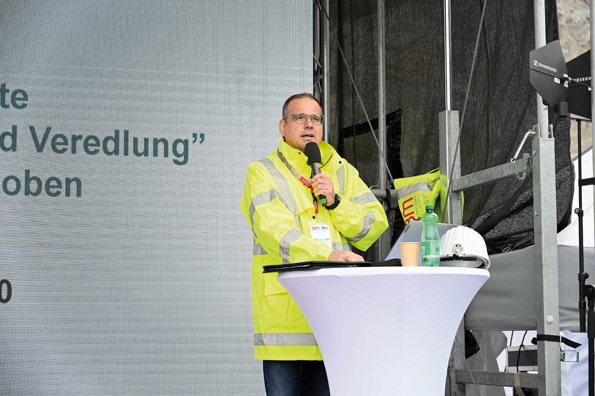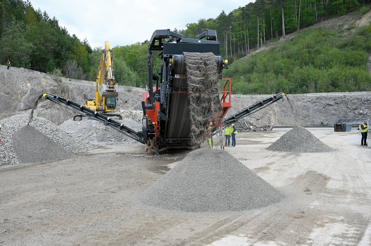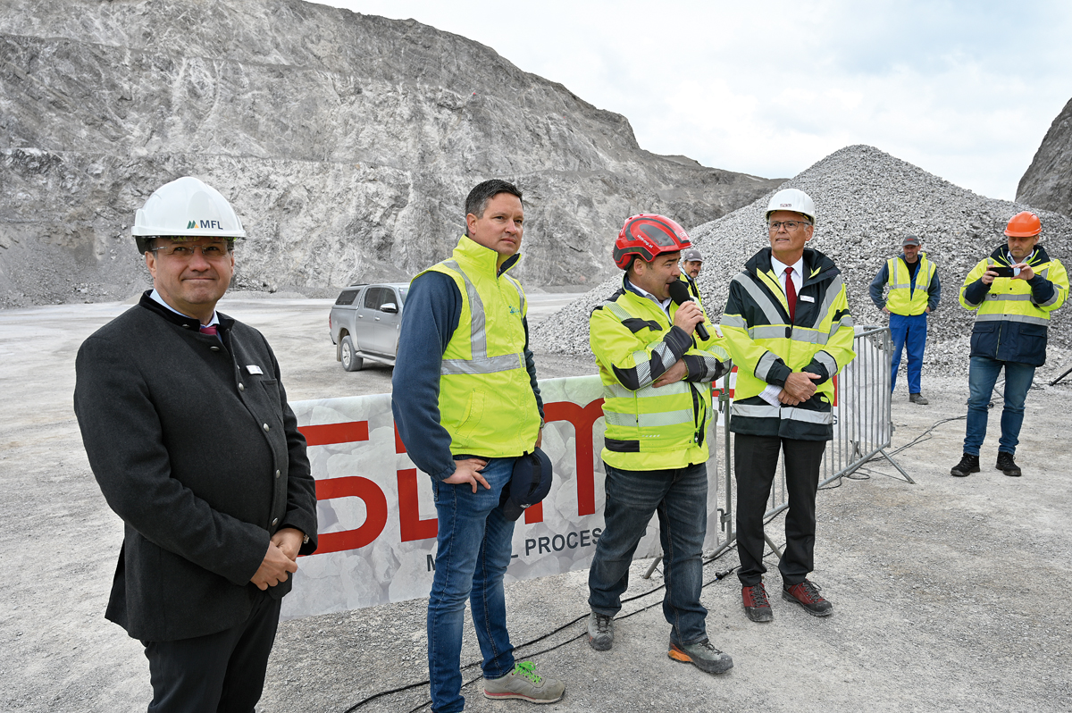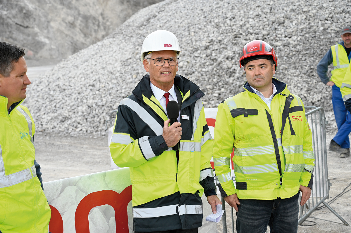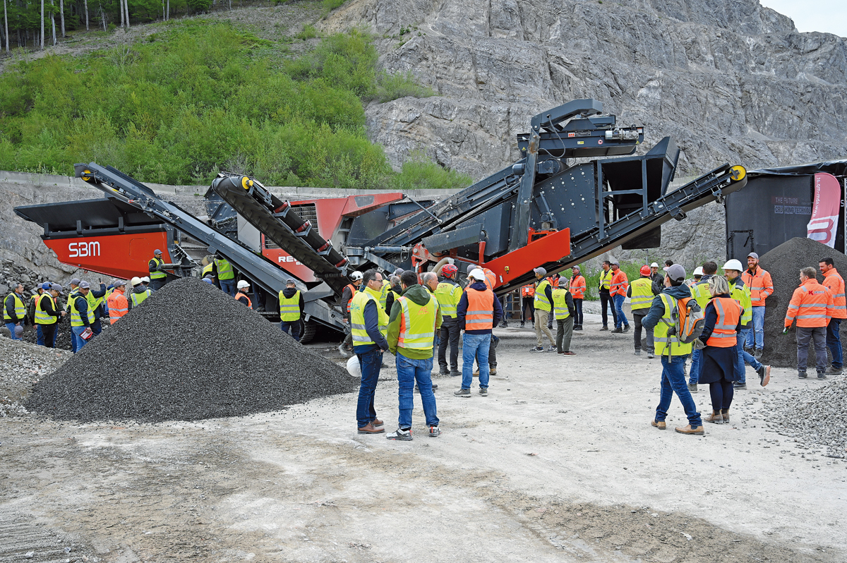 Neben einem nunmehr hellwachen Publikum hatte die Sprengung auch zur Folge, dass die Remax 600 genügend »Futter« für die Live-Vorführung bekam. Abgebaut wird in dem von der Unternehmensgruppe Zöchling betriebenen Steinbruch vorwiegend Dolomit. Über eine ausgeklügelte Materialseilbahn, die sich über das weitläufige Abbaugebiet erstreckt, gelangt das herausgelöste Material zu den Weiterverarbeitungsanlagen. Und genau hier ist Zöchling bereits seit vielen Jahren treuer Verfechter von SBM-Brechern, weshalb auch die Unternehmensgruppe einen genauen Blick auf die neue Anlage geworfen hat. »Wir freuen uns, dieses Event im Steinbruch der Firma Zöchling veranstalten zu dürfen, einem Partner, den wir bereits seit vielen Jahren mit unseren Maschinen begleiten dürfen und der uns heute eine tolle Plattform für die Präsentation unseres neuen Brechers bietet«, so SBM-Geschäftsführer Erwin Schneller.