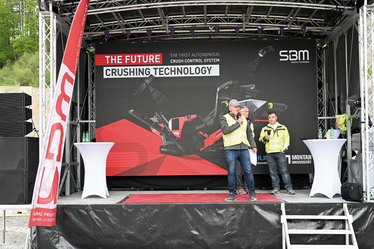 Die Remax 600 wurde den geladenen Gästen allerdings auch als Technologieträger für die vollautonome Produktionsüberwachung und -steuerung vorgestellt, die der Hersteller aktuell in Zusammenarbeit mit Forschern der Montan-Universität Leoben entwickelt. Bereits seit Jahren kooperiert SBM Mineral mit dem dortigen Innovationszentrum für Rohstoffe (IZR). So laufen seit 2021 etwa die Arbeiten an dem groß angelegten F&E-Projekt »Autonomes Brechen« mit dem Ziel, selbstlernende mobile Brecher zu entwickeln, wie Lehrstuhlleiter Helmut Flachberger von der Montan-Universität Leoben im Rahmen des SBM-Events verdeutlichte. Zu seinen Forschungsschwerpunkten im Fachbereich Aufbereitung und Veredlung zählen u. a. die Aufbereitung mittels erneuerbarer Energiequellen, die Digitalisierung in der Aufbereitung sowie die Prozessoptimierung durch Online-Analytik und das autonome Aufbereiten. »Das erklärte Ziel unseres Forschungsprojekts mit SBM Mineral ist, einen innovativen, flexibel einsetzbaren, selbstlernenden, aber eben auch bedienerfreundlichen, emissionsarmen und sicheren mobilen Prallbrecher zu entwickeln«, so Helmut Flachberger. »Wir wollen Maßstäbe in Richtung autonomes Aufbereiten mit Mobilanlagen durch den Einsatz cyberphysikalischer Systeme und adaptiver Steuerungen setzen und dabei die Grenzen des Machbaren aus technologischer wie wirtschaftlicher Sicht ausloten.«