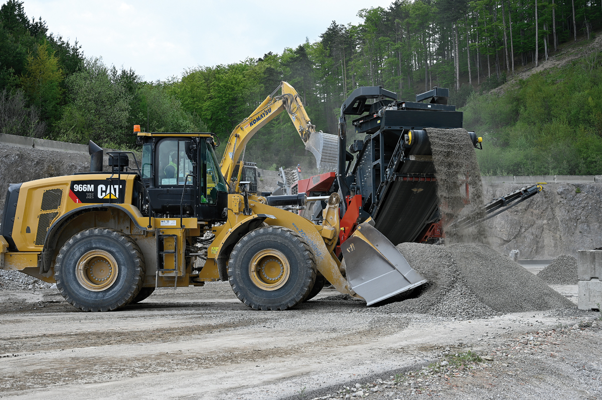 Arbeiten musste die 600er im Steinbruch unter möglichst realistischen Baustellenbedingungen: Zum Einsatz kam deshalb jede Menge schweres Gerät.