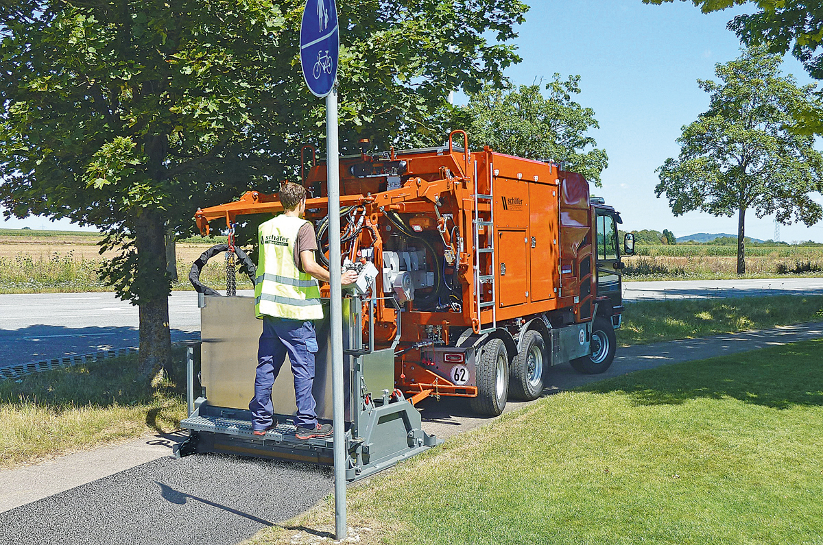 Mit der SM 1700 ist uns ein kleines Kunststück gelungen«, betont Mirko Remmel, Vertriebsleiter bei schäfer-technic. Die Spezialmaschine reduziert laut Joachim Wesner, bei der Entwicklung der Maschine verantwortlicher Geschäftsführer, die Funktion der großen Maschinen auf Fahrradwegbreite.