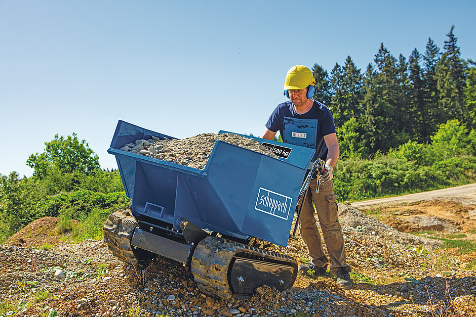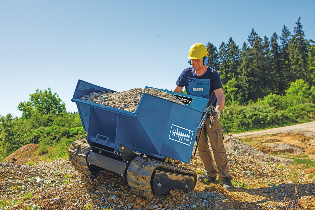 Ob Erde, Kies oder Schutt – ein Dumper ist ein geeigneter Helfer, sobald etwas Schweres transportiert werden muss. Der Scheppach-Dumper DP5000 wird von einem 4,1 kW (5,6 PS) starken 4-Takt-Benzinmotor angetrieben und vermag Lasten bis zu 500 kg zu bewegen. Der Kettenantrieb unterstützt den maximalen Halt auf allen Untergründen. Die Spurbreite beträgt 180 mm.