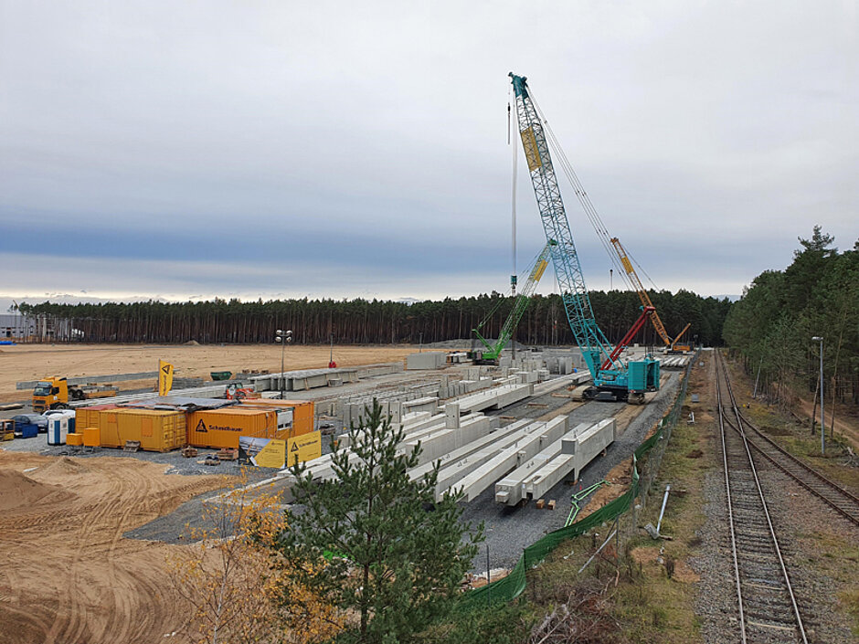 Ganz nach Teslas Philosophie wird auf dem Bau ständig dazugelernt und optimiert, weshalb mit den kleinen Gebäuden angefangen wurde. Zwischen Zeitmanagement und Genehmigungen gibt es auch einiges an Betonmasse zu stemmen. Der Bau wird größtenteils aus Betonfertigteilen geschaffen, diese werden mittels Bahn direkt vom Max Bögl Werk in Sengenthal und Hamminkeln geliefert. Die Bahnhofslogistik wird hierbei komplett von Schmidbauer gemanagt.