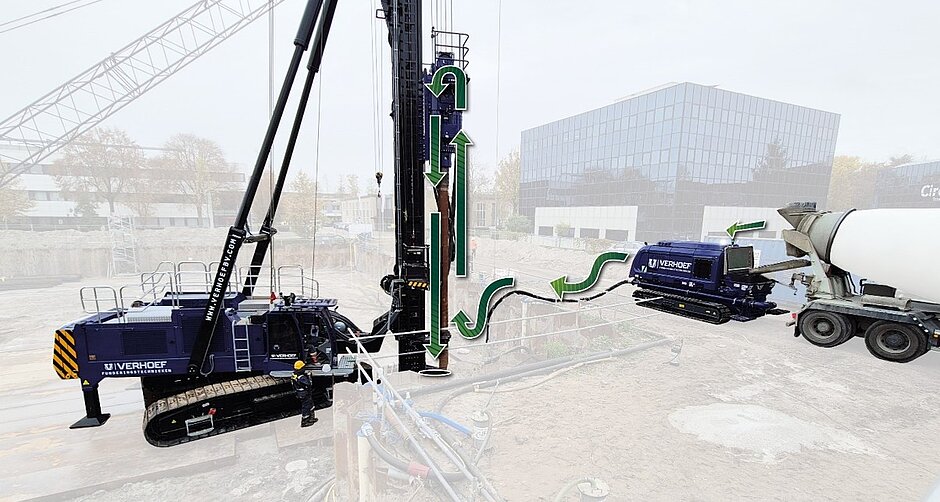 Die Verhoef Funderingstechnieken BV aus Meerkerk ist Spezialist auf dem Gebiet der Erstellung von Bohrlöchern und ihrer Verfüllung. Ihre Anforderungen- u.a. die präzise aufeinander abgestimmte automatisierte Taktung von Bohrung und Verfüllung zu klar definierten Zeitpunkten und Bohrer- sowie Pumpenzuständen -waren es, die letztlich die beteiligten Projektpartner zusammengebracht haben. Die SCHWING GmbH, als führender Hersteller von Betonpumpen jeglicher Art, bietet neben herkömmlich angetriebenen Pumpen bereits seit vielen Jahren auch elektrisch angetriebene Stationärpumpen auf Raupen- oder konventionellem Fahrgestell in exzellenter Qualität an und war damit als Wunschpartner im Projekt der Niederländer gesetzt.