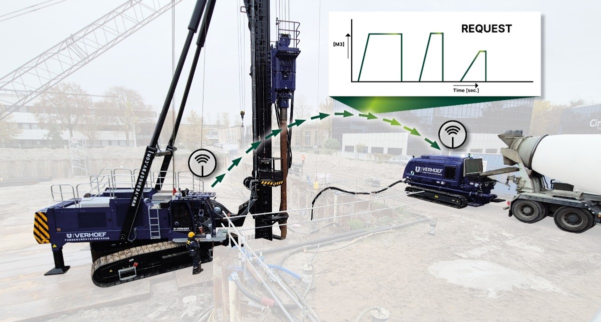 Drahtlose Kommunikation und Dokumentation Die Betonpumpe übermittelt die gepumpte Betonmenge an die Pfahlgründungsmaschine