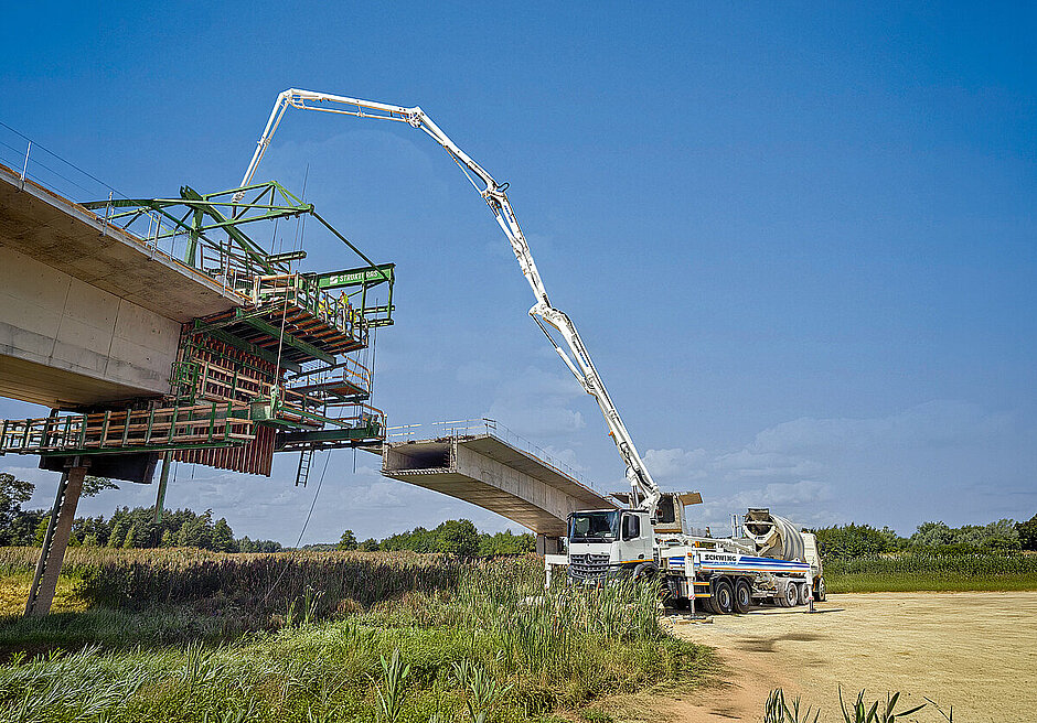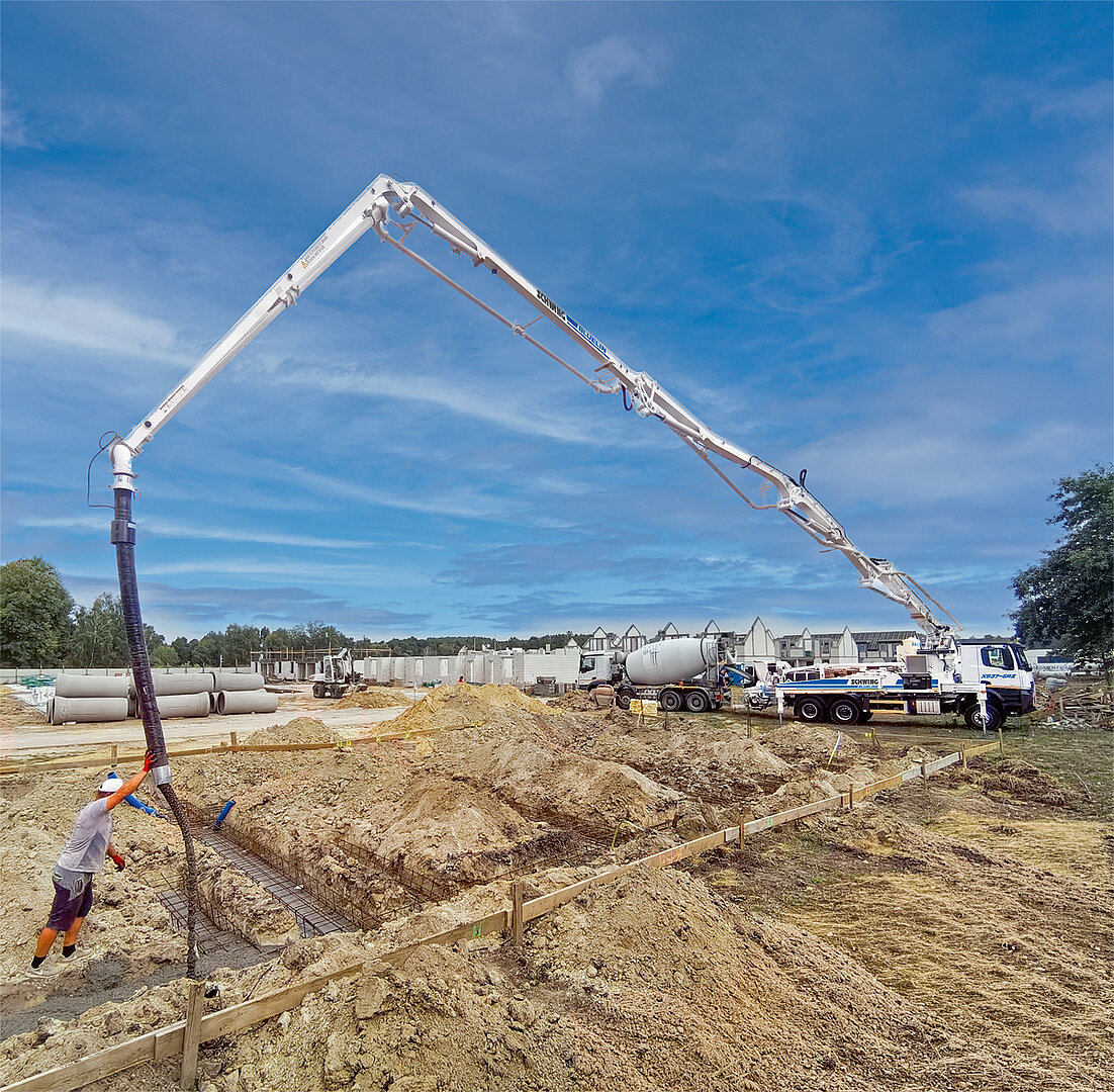 Ausgestattet ist die Maschine mit einem fünfteiligen RZ-Mast in DN-125-Förderleitungsdimension. Die maximale Reichhöhe beträgt 36,1 m, während die Ausfalthöhe 7 m beträgt. Die gewählte Faltungsart ermöglicht laut Schwing kompakte Transportmaße bei gleichzeitig hoher Flexibilität im Arbeitsbereich. Teilabstützungssysteme, wie das »Partial Support System«, ermöglichen einen sicheren und effizienten Einsatz auch auf Baustellen mit stark beengten Verhältnissen, etwa in innerstädtischen Straßen, bei Nachbarbebauung oder eingeschränkten Zufahrten. Statt alle Abstützungen vollständig auszufahren, können einzelne Stützen verkürzt oder in mehreren Stufen positioniert werden, sodass die Pumpe trotz Hindernissen standsicher arbeitet. Dadurch lassen sich deutlich mehr Aufstellpositionen realisieren, was laut Hersteller die Flexibilität erhöht, Wartezeiten und Umsetzvorgänge reduziert und die Betonierleistung auf schwierigen Baustellen spürbar verbessert.