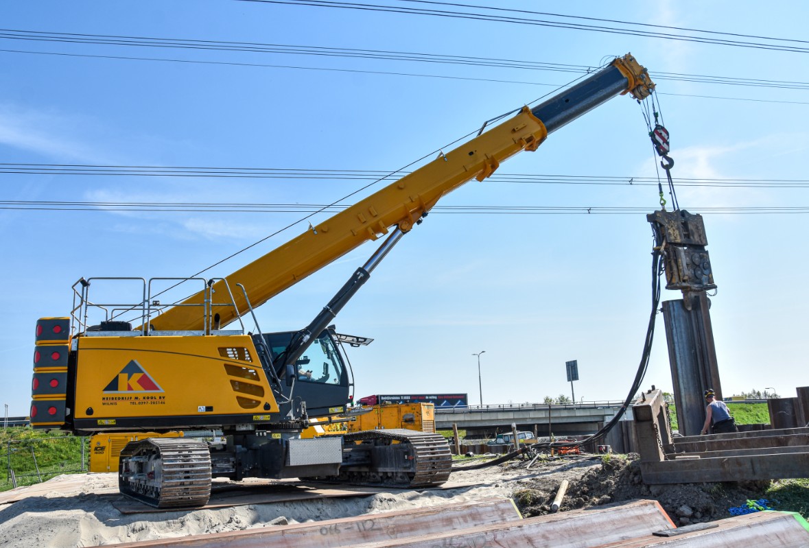 Seit mehr als 45 Jahren ist die Heibedrijf M. Kool BV aus Wilnis in den Niederlanden Spezialist für Fundierungsarbeiten. Von ihrem Kunden VOBI wurden sie nun beauftragt, Spundwände für den Bau einer neuen Pumpstation in der Region Westland zu montieren. Für die Fachleute eigentlich kein Problem – wäre da keine tiefhängende Hochspannungsleitung mit im Spiel. Auf dieser hochkomplexen Baustelle glänzt der 70t Raupentelekran von SENNEBOGEN vor allem durch seine Vielseitigkeit und Präzision.