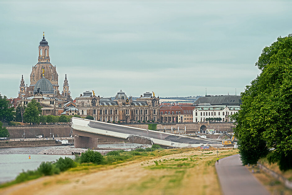 Ein Abschlussgutachten ergab, dass der Einsturz der Dresdener Carolabrücke auf eine »wasserstoffinduzierte Spannungsrisskorrosion« zurückzuführen sei, die durch das Eindringen von Feuchtigkeit noch während der Bauphase entstand. Verstärkt habe sich das Ganze durch Materialermüdung im Spannstahl – beim Einsturz waren beispielsweise komplette Querträger abgerissen worden. Letztlich waren die Schäden derart massiv, dass die Brücke komplett zum Abriss freigegeben wurde. Eine Besonderheit war, dass die Abbrucharbeiten ohne langwieriges Ausschreibungsverfahren erfolgten. Der Grund: Im Februar stellten Überwachungssysteme weitere Spanndrahtbrüche in den Brückenzügen fest, wodurch akute Einsturzgefahr bestand. Die neue Gefährdungslage zwang die Stadt Dresden dann zu schnellem Handeln: »Um Gefahren, die vom Bauwerk ausgingen, schnell auszuräumen, haben wir die Arbeiten direkt vergeben«, so Oberbürgermeister Dirk Hilbert. »Draht für Draht konnten wir über das eingesetzte Schallemissionsmonitoring dabei zuhören, wie die Restsicherheit der Brücke schwindet.« Erschwerend kam hinzu, dass bereits zu Jahresbeginn gleich mehrere Fliegerbomben in unmittelbarer Nähe gefunden worden waren. In der Vorbereitungsphase der Rückbauarbeiten waren deshalb Drohnenüberflüge notwendig, um die komplizierten Kampfmittelsondierung in der Elbe zu unterstützen.