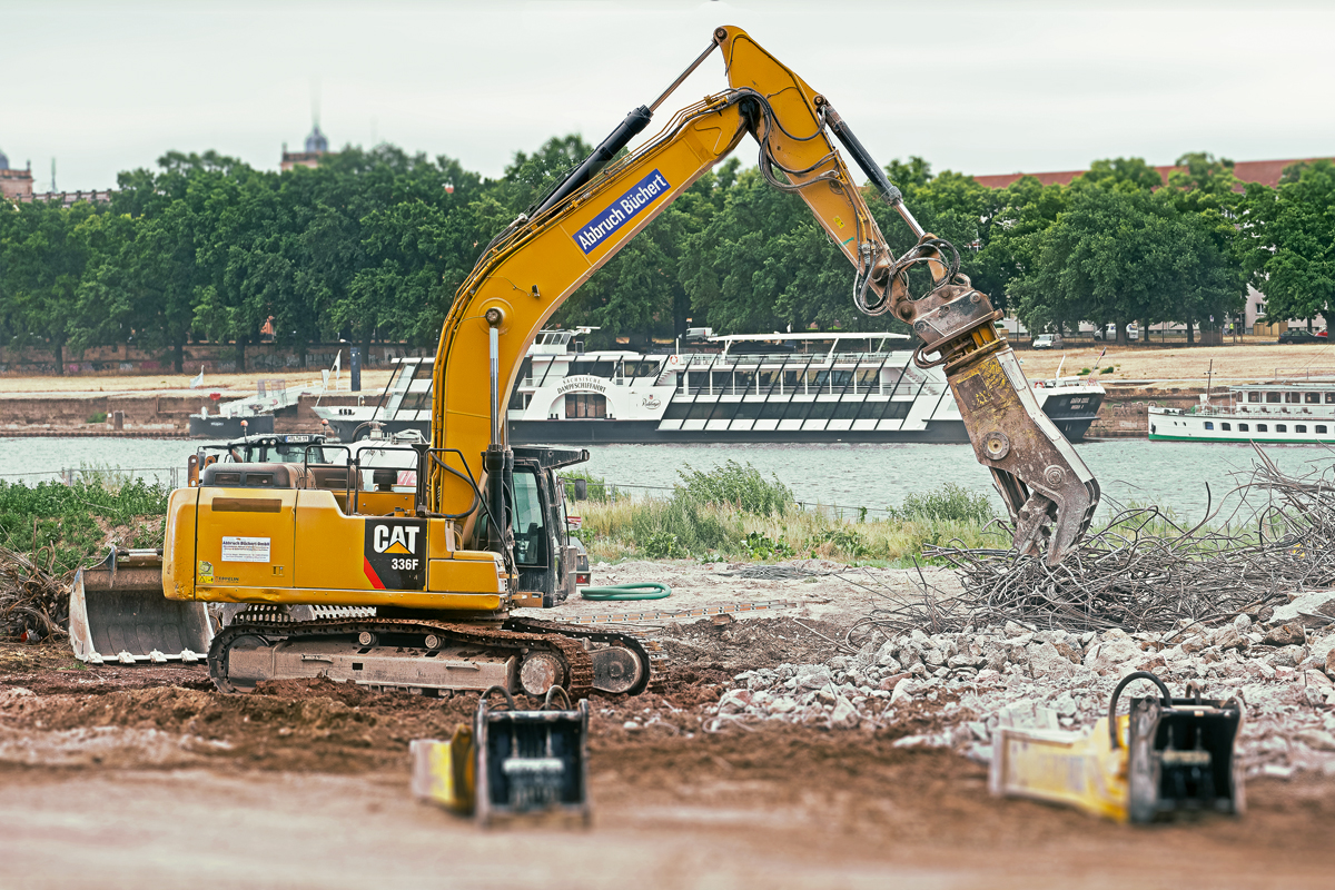 Zum Zeitpunkt unseres Redaktionsbesuches hat das bauMAGAZIN Anfang Juli den Abriss des nunmehr letzten verbliebenen, aber bereits vom Sockel gekippten Brückenzugs begutachtet. Geplant war und ist, dass die Abrissarbeiten an der Elbe bis Ende Juli abgeschlossen sein sollten. Einher geht das allerdings mit der Tatsache, dass im Anschluss auch die Wiederherstellung des ursprünglichen Sohlniveaus vorgesehen ist, um die künftige Befahrbarkeit der Wasserstraße zu gewährleisten. Die dafür erteilte Genehmigung sieht eine Laufzeit bis Anfang September vor – danach sollen noch Abrissarbeiten auf der Landseite des Neustädter Ufers erfolgen, die voraussichtlich bis Jahresende abgeschlossen sein dürften. Laut der Stadt Dresden sollen sich die Kosten für den Abriss auf »bis zu 18 Mio. Euro« belaufen. Ebenso wurde kürzlich bekannt gegeben, dass der Ersatzneubau bereits beschlossen ist – durch den Wegfall eines zeitfressenden Planfeststellungsverfahrens, so die Stadt, könne die neue Brücke drei bis sechs Jahre früher fertiggestellt werden. Bislang ist bekannt, dass der tatsächliche Wiederaufbau der Carolabrücke im Jahr 2027 starten soll – insgesamt rechnet man mit einer Bauzeit von rund zweieinhalb Jahren.