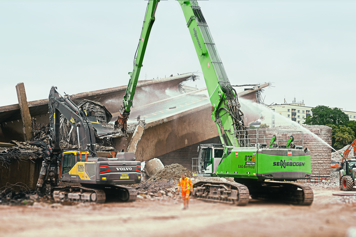 Nach diversen Verzögerungen konnte der Abbruchspezialist EAG-Berthold aus Colditz im Juni damit beginnen, die beiden verbliebenen Brückenzüge zum Einsturz zu bringen. Hierfür wurden tragende Spannglieder der Brücke freigelegt und anschließend durchtrennt. Um diese Aufgabe zu meistern, setzte das Abbruchunternehmen auf ein echtes Schwergewicht, das die notwendige Power mit sich bringt: Ein »870E Demolition« aus dem Hause Sennebogen sorgte für den kontrollierten Einsturz. Im Vorfeld wurde ein Fallbett aus Schotter in der Elbe errichtet, um die herabfallenden Trümmerteile »aufzufangen« Im Anschluss waren weitere zehn Bagger darum bemüht, die Brückenteile zu zerlegen und die Trümmer für den Abtransport vorzubereiten. Zur Verfügung gestellt wurde der »870E Demolition« von Schlüter Baumaschinen (Schlüter-Rent): Die leistungsstarke Mietmaschine kommt auf ein stolzes Einsatzgewicht von 117 t und eine Reichweite von bis zu 36 m. »Durch die hochfahrbare und neigungsfähige Fahrerkabine hat der Maschinist perfekte Sicht auf den gesamten Arbeitsbereich – außerdem verfügt der »870er« über einen teleskopierbaren Unterwagen, was sowohl eine geringe Transportbreite als auch eine hohe Standsicherheit mit sich bringt«, so Uwe König, Serviceberater bei Schlüter Baumaschinen, der das bauMAGAZIN gemeinsam mit Sebastian Loibl, Verkaufsleiter Abbruch bei Sennebogen, vor Ort begleitet hat. Die Longfront-Abbruchmaschine verfügt über einen Dieselmotor mit 298 kW Leistung und gilt innerhalb der Branche als besonders präzises und erschütterungsfreies Abbruchtalent. Tatsächlich lassen sich mit dem »870E« neun- bis zehnstöckige Gebäude sicher abbrechen.