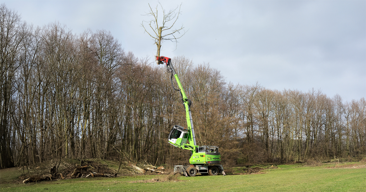 Der Sennebogen 718 E Umschlagbagger für Baumpflege, Landschaftspflege und Energieholzernte hat eine Reichweite von 13 Metern und überzeugt durch Kompaktheit, Komfort und Flexibilität. Die Forstumschlagmaschine könnte zudem durch seine platzsparenden Abmessungen, einem geringen Heckschwenkradius und einem niedrigen Eigengewicht punkten – der Einsatz auf engen Forstwegen oder viel befahrene Straßen stelle für den kompakten Umschlagbagger kein Problem dar. Mit einem Transportgewicht von unter 22 Tonnen genügt ein 3-Achs-Tieflader zum Versetzen des Fällbaggers. Eine optionale Straßenzulassung bietet zusätzliche Flexibilität.