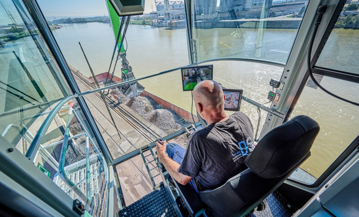 Über ein durchdachtes System an Treppen und Aufstiegen ist die eigens für den Hafen entwickelte Großraumkabine Portcab schnell erreicht, von der aus die Fahrer Schiffsentleerung, LKW- und Zugbeladung aus der Vogelperspektive gleichzeitig vornehmen. „Ich höre jeden Tag von meinen Fahrern, dass die Kabine des 895 der schönste Arbeitsplatz des gesamten Hafens ist“, meint Dobesberger abschließend mit einem Lächeln.