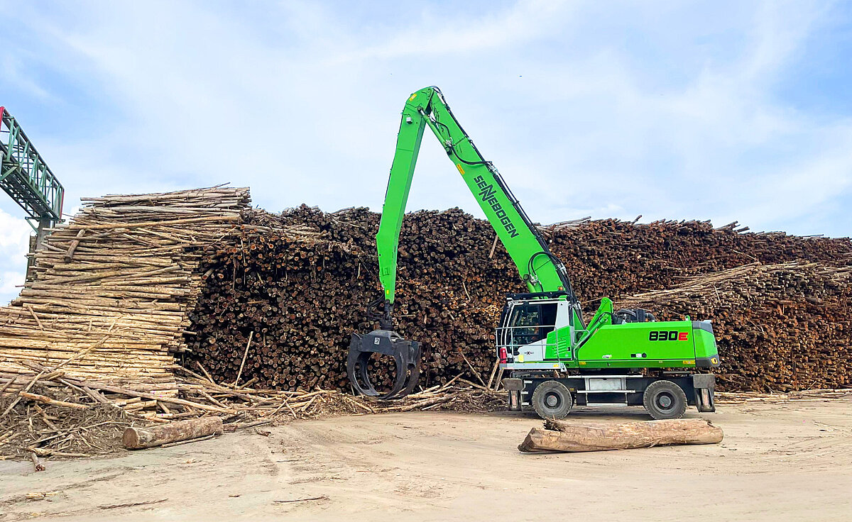 Um seine hohen Anforderungen zu erfüllen, entschied sich RAPP für Sennebogen-Materialumschlagmaschinen. Im April 2024 wurden neun neue Sennebogen 830 E-Materialumschlagmaschinen in Betrieb genommen, die speziell für den Umschlag großer Holzmengen entwickelt wurden und auch unter hohem Druck zuverlässig arbeiten. Der Holzumschlag ist das Rückgrat der Geschäftstätigkeit von RAPP. Das Material kommt aus Plantagen, wird entladen, sortiert und mit hoher Geschwindigkeit zu den Verarbeitungslinien transportiert. Jede Verzögerung beim Holztransport kann sich direkt auf die Produktion auswirken.