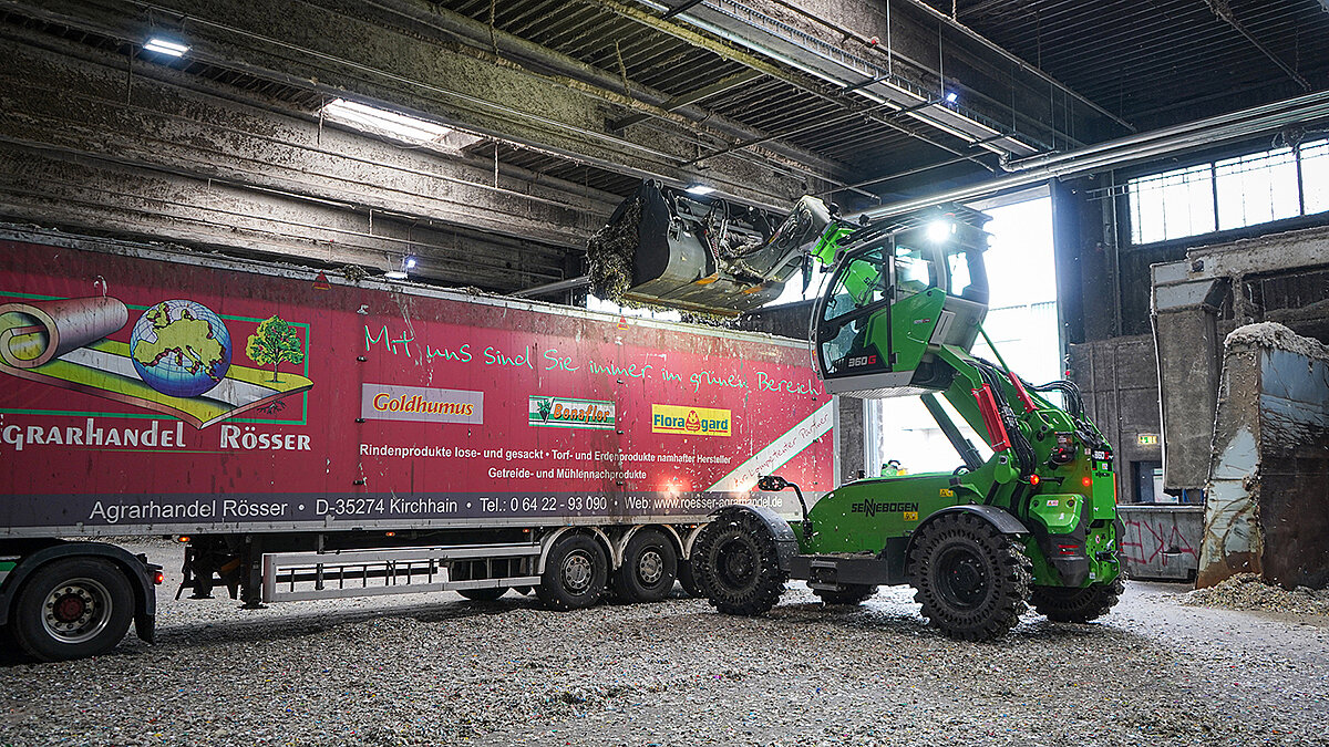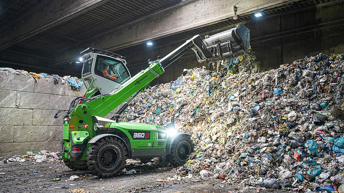 Nach der Anlieferung wird gemischter Abfall – darunter Sperrmüll und Hausmüll mit Bioanteil – zunächst mit dem Teleskoplader aufgeschoben. So lässt sich die verfügbare Lagerfläche optimal nutzen. Die hohe Schubkraft des 360 G ermöglicht es, auch größere Mengen zügig zu bewegen und das Gelände übersichtlich zu strukturieren. Nach dem Aufschieben des angelieferten Haus- und Sperrmülls kommt der 360 G zunächst bei der Hausmüllaufbereitung zum Einsatz, wo er den internen Sackaufreißer mit Material beschickt. Im Bereich der Sekundärbrennstoffe (SBS) über-nimmt der Teleskoplader anschließend das Verladen der aufbereiteten Materialien auf Lkw. Dabei wird das Material mit der Schaufel zusätzlich komprimiert – für ein maximiertes Ladevolumen und eine reduzierte Zahl an Transportfahrten. Der Teleskoparm des 360 G spielt dabei eine entschei-dende Rolle, da er mit seiner Reichweite tief in die Lkw hineinreicht und das Material gezielt ver-dichten kann. So unterstützt der Teleskoplader zuverlässig alle logistischen Abläufe von der Auf-bereitung bis zum Abtransport.