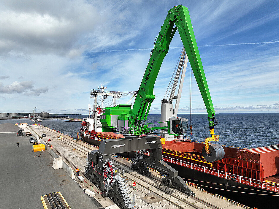 Für Vorstandsmitglied Rain Rannala war die neue Umschlagmaschine ein entscheidender Schritt in der Weiterentwicklung des Standorts: „Wir wollten unser Spektrum erweitern und Stahlcoils bis zu 32 t abfertigen – dafür ist der Sennebogen 885 G genau die richtige Maschine.“