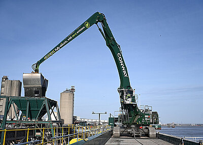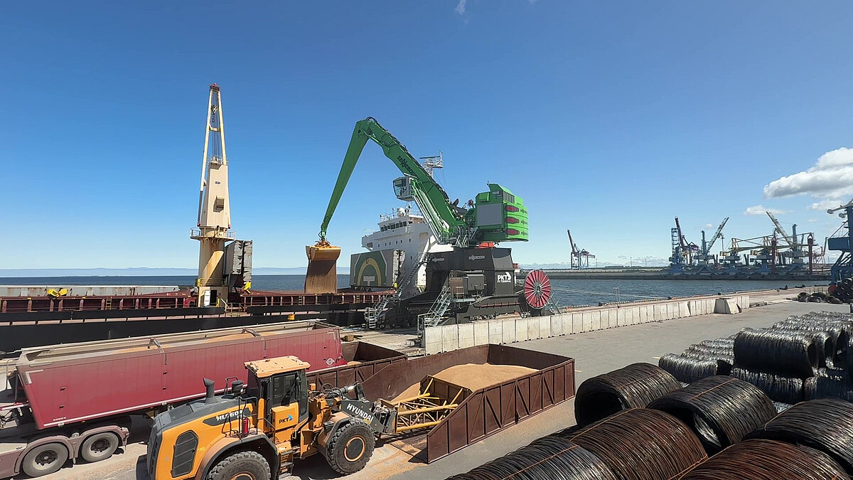 Mit dem K32-Ausleger kann der neue Umschlagbagger mühelos zwischen Schiff, Waggon und Schüttgutbox verladen. Beim anspruchsvollen Schüttgutumschlag erreicht der 885 G beeindruckende 30 Sekunden pro Ladezyklus und garantiert damit hohe Umschlagleistungen am estnischen Frachtterminal.