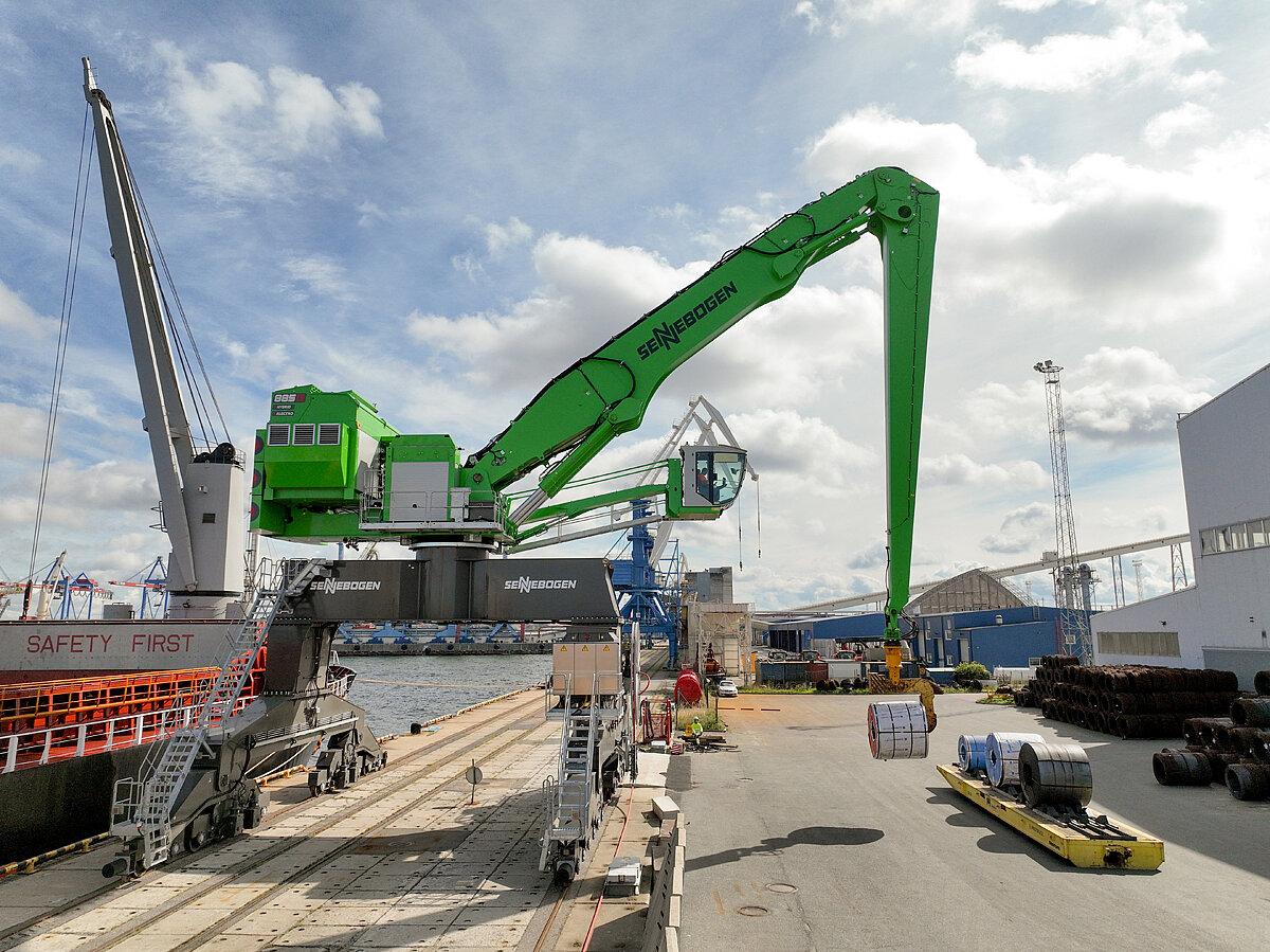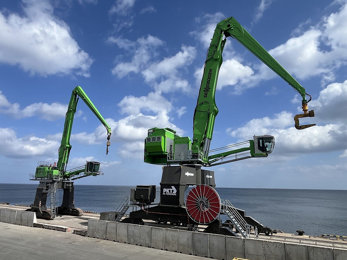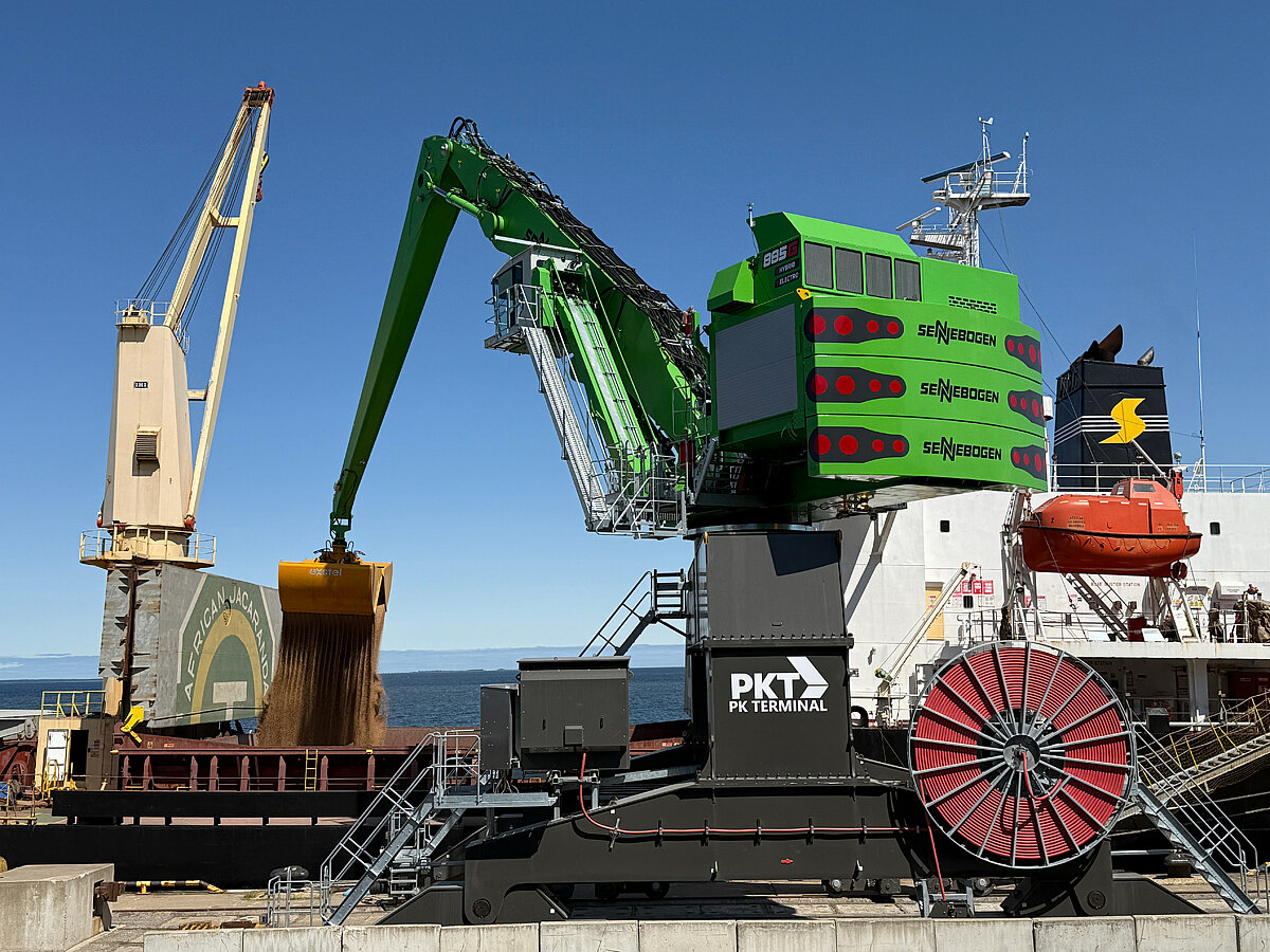 Um den hohen Anforderungen am Standort gerecht zu werden, wurde die Maschine individuell an die Gegebenheiten vor Ort angepasst. Das Schienenportal sorgt für einen niedrigen Bodendruck und einen sicheren Betrieb am Kai. Die neue Portcab-Fahrerkabine mit Syklift-Höhenverstellung erhöht den Komfort auch für lange Schichten. Eine zusätzliche Kamera am Ausleger gewährt zudem eine optimale Sicht in den Schiffsrumpf. Seit der Gründung vertraut das PK Terminal bei Neuanschaffung und Wartung der Maschinen dem Sennebogen Service- und Vertriebspartner ScanBalt Crane.
