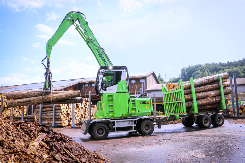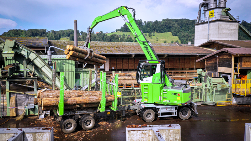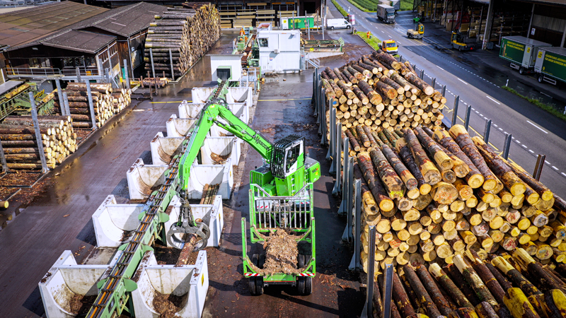 Im Zuge der anstehenden Neugestaltung des Rundholzplatzes am Standort Worb wurden die Transportwege im Sägewerk analysiert. Ein neues Konzept, bestehend aus der Umschlagmaschine 730 E-Serie von SENNEBOGEN und einer geländegängigen Anhänger-Applikation, erwies sich dem früheren Platzkonzept mit Portalkran als überlegen. Heute übernimmt die Holzfahrmaschine das Verheben der Rundhölzer. Aber nicht nur das, denn der 730 E-Serie mit Anhänger hat viele Zuständigkeiten und ist permanent im Einsatz: Er transportiert täglich viele Tonnen Holz vom Rundholzplatz bis zum Sortierstrang, stapelt Holzstämme auf, belädt den Anhänger und beschickt die Säge.