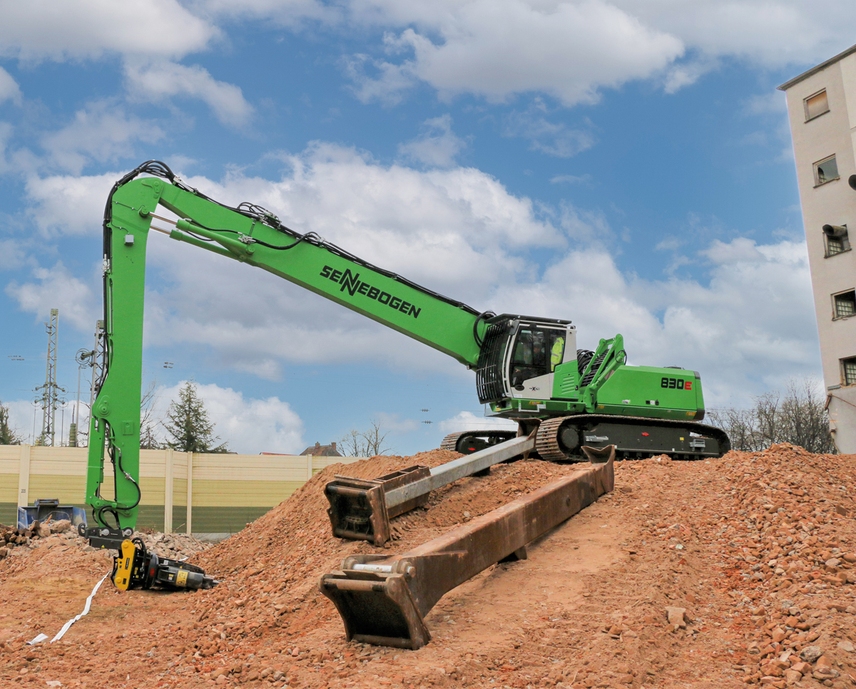 Eine leistungsstarke Maschine ist im Abbruchsektor bedeutsam, sollen doch die Arbeiten schnell und effizient von der Hand gehen, um zügig Platz für die weitere Nutzung des Geländes zu schaffen. Der Sennebogen 830 E ist mit einem teleskopierbaren Raupenlaufwerk ausgestattet und bietet eine laut Hersteller optimale Standsicherheit vor allem auf einem aufgeschütteten Abbruch-Plateau. Dank der geringen Transportbreite ist ebenfalls ein einfacher Transport der Maschine zum nächsten Einsatzort möglich.