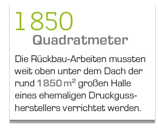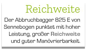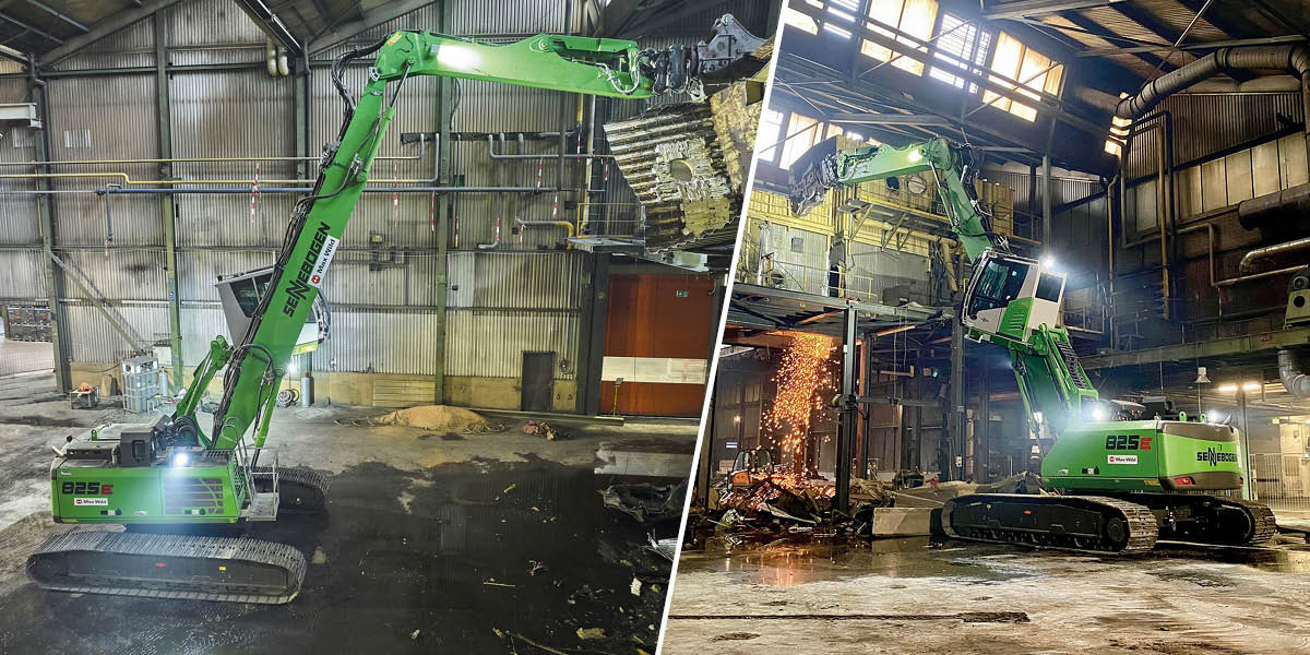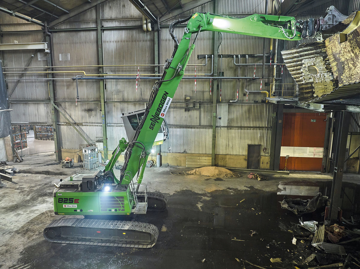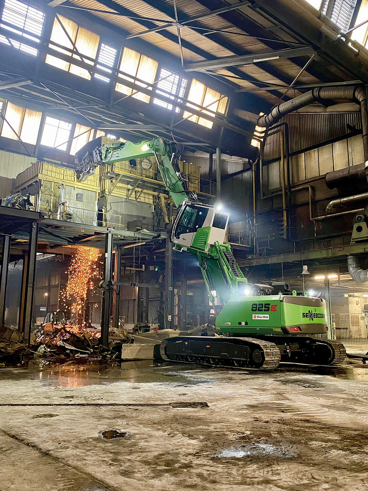 Der 825 Abbruchbagger mit seiner großen Reichweite ist genau die passende Maschine am richtigen Ort. Einfache Manövrierbarkeit durch das Raupenlaufwerk erleichtert das Arbeiten innerhalb eines Gebäudes. Ausgerüstet mit Abbruchzange und Greifer, werden die einzelnen Komponenten durchtrennt und für das Recycling vorsortiert. Ganze Anlagenhäuschen können aufgrund des langen Auslegers des 825 E von der zweiten Ebene der Halle gehoben und zerschnitten werden. Auch Stahlträger müssen aus der Produktionshalle raus, das heißt, auch schwere Lasten gilt es zu bewegen. Der Abbruchbagger 825 E von Sennebogen kann individuell an vielen Orten eingesetzt werden. Seine kompakte Bauart bietet optimale Wendigkeit. Eine große Reichweite ermöglicht die Arbeiten aus sicherer Entfernung, vor allem wenn die Maschine in großer Höhe arbeitet. Der kontrollierte Rückbau, den die Firma Max Wild GmbH durchführte, wurde im Mai abgeschlossen, denn die neue Megacasting-Anlage soll ab Ende des Jahres in Betrieb gehen. Der Maschinenführer war sichtlich begeistert von der Maschine aus dem Hause Sennebogen: »Die Maschine ist wirklich einfach zu bedienen. Sie spricht auf feinste Impulse an. Besonders gut lässt sich mit dem Sennebogen in der Höhe arbeiten.« Mit der Kabine, die nach oben gefahren und auch noch geneigt werden kann, hat der Fahrer das Arbeitswerkzeug und die Umgebung sicher im Blick.d