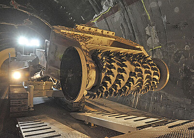 Das Besondere dabei: Aufgrund des patentierten Mechanismus’ kann der Abstand der Siebwellen von der Fahrerkabine aus verändert werden. Somit konnte das Material vom Fahrer direkt in unterschiedlichen Korngrößen aufgehäuft werden. Wie große Felsstücke aus der Wand gebrochen werden, das wurde mit dem Vibrationsripper RV 5000 von Socomec eindrucksvoll vorgeführt. Ein großer Vorteil dieses 5-t-Gerätes ist, so Socomec, dass er im Gegensatz zu vergleichbaren Geräten beim Anlaufen nicht aufgesetzt werden muss. ß