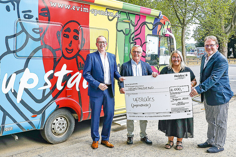 Der ehemalige Soka-Bau-Vorstand Manfred Purps und sein Nachfolger Gerhard Mudrack haben einen Scheck über 6 000 Euro an das Jugendhilfeprojekt »Upstairs« übergeben, eine Anlaufstelle für junge Menschen in Not in Wiesbaden.