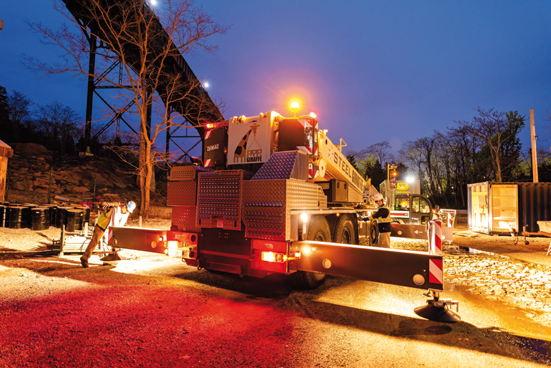 Steel Giraffe gab für das Projekt ein Angebot ab – unter Nutzung des AC 45 City auf der Brückenfahrbahn, um das Material mehr als 30 m auf die darunter befindliche Plattform abzulassen. Als Herausforderung musste sichergestellt werden, dass die Brücke das Gewicht des Krans plus Last tragen würde. »Hier half uns die Planungs-Software dabei, das Gewicht, den Radius und die Stellung der Abstützungen festzulegen, um nachzuweisen, dass die Brückenfahrbahn ausreichend tragfähig war«, so Steve Kelly. »Bei der Ausarbeitung des Plans wurden wir sowohl von Empire Crane als auch von Demag tatkräftig unterstützt.«