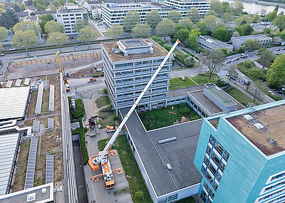Es waren nicht nur die kurzen Abmessungen, die den Tadano AC 7.450-1 auf der Baustelle für Egger zur ersten Wahl machten – der 7-Achser zeichnet sich auch noch durch eine nicht minder kompakte Abstützung aus: »Die ließ sich perfekt auf das Stützenraster der Tiefgarage anpassen, auf deren Dach wir den Kran platzierten. Ohne die hohe Flexibilität des Abstützsystems hätten wir große Probleme mit der Positionierung unseres Krans gehabt«, erklärt Beat Greuter.