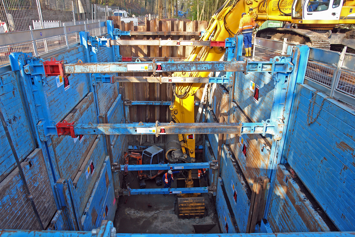 Der sogenannte Großflächen-Stahlverbau nahm an Bedeutung zu. Dabei handelt es sich um tragende Stahlhohlprofilwände, die mit verstellbaren Spreizen auf Abstand gehalten werden und einen Verbaukasten bilden. Unabhängig von der Grabenbreite und der Verbautiefe erfüllen die verschiedenen Systeme alle die wichtigsten Anforderungen: hohe Sicherheit durch Stabilität, geringe Auswirkungen auf den Boden außerhalb des Verbaus sowie möglichst große Arbeitsräume. Seit 75 Jahren sind die Ziele damit gleich geblieben. Von den heutigen technischen Möglichkeiten und der Vielfalt der Produktlösungen wagte damals allerdings wohl noch niemand zu träumen.s
