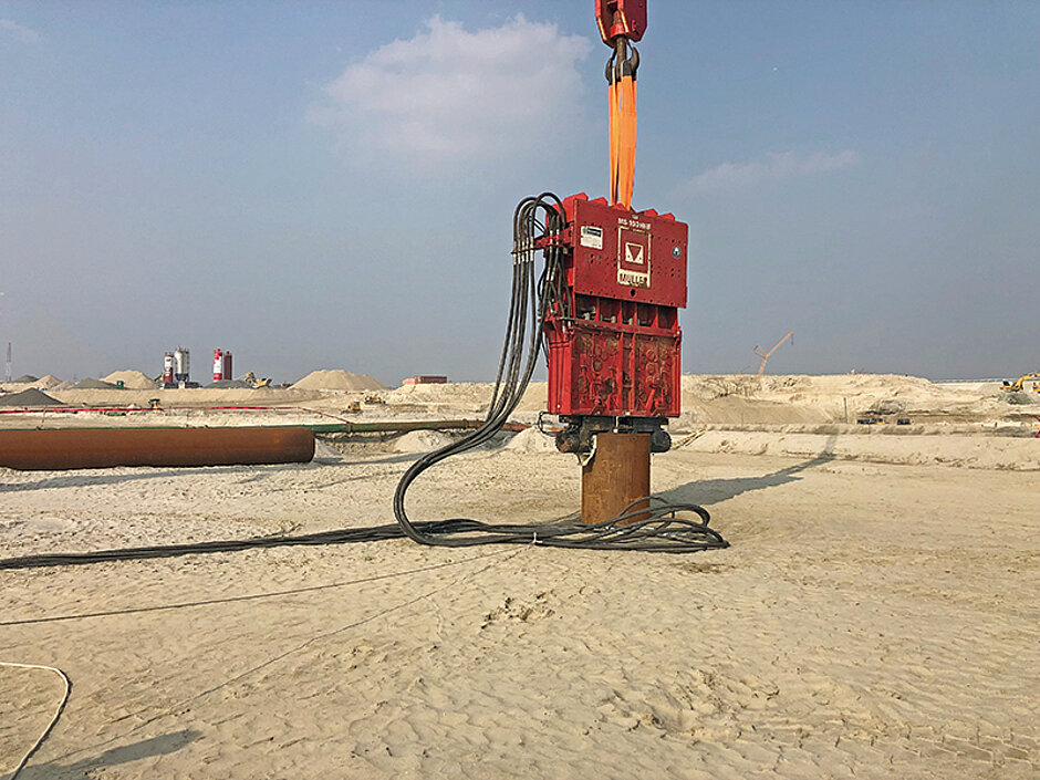 Sand gilt als einer der schwierigsten Böden überhaupt. »Für die großen Rohre kam daher nur unser müller-MS-210 HHF mit MS-A 1150 V in Frage. Der Vibrator zählt zu einem der leistungsstärksten in der Branche«, so Munteanu. Neben der Inbetriebnahme der Vibratoren vor Ort leisten die Experten von thyssenkrupp Infrastructure während des gesamten Projekts technische Beratung. Ein wichtiger Projektschritt war unter anderem der Entwurf für die Verankerung der ASF-Bohrpfähle. t