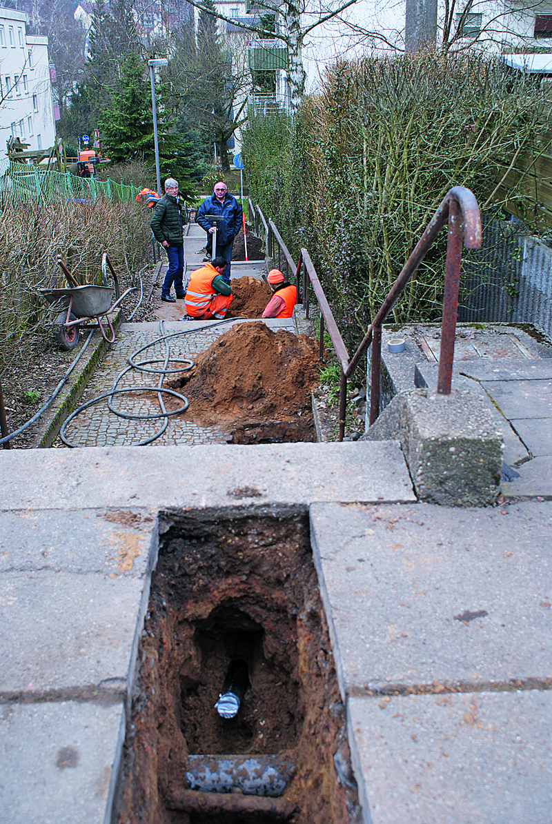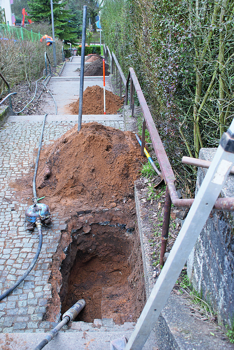 In der relativ steilen Hanglage der Richard-Wagner-Straße im Saarbrücker Stadtteil Dudweiler ging es im März treppauf und treppab, drunter und drüber; Leerrohre für den Einzug von Glasfaserkabeln warteten auf ihre Verlegung. Hier machte der Standard eine von vielen Ausnahmen: Der Verlauf der vorgesehenen Trasse für die Glasfaserleitung führte entlang einer rund 30 m langen, mit Absätzen und Versätzen gegliederten Steintreppe, beidseits von privaten Grundstücken gesäumt.