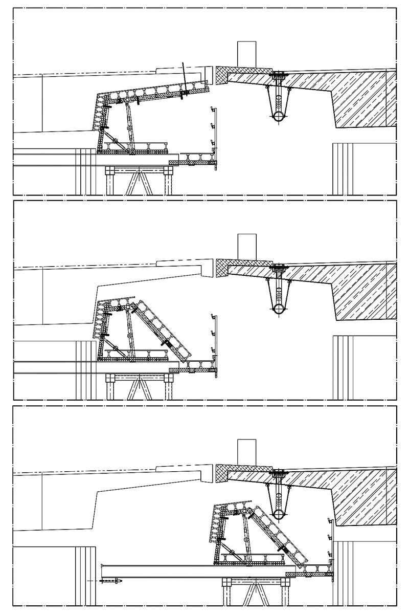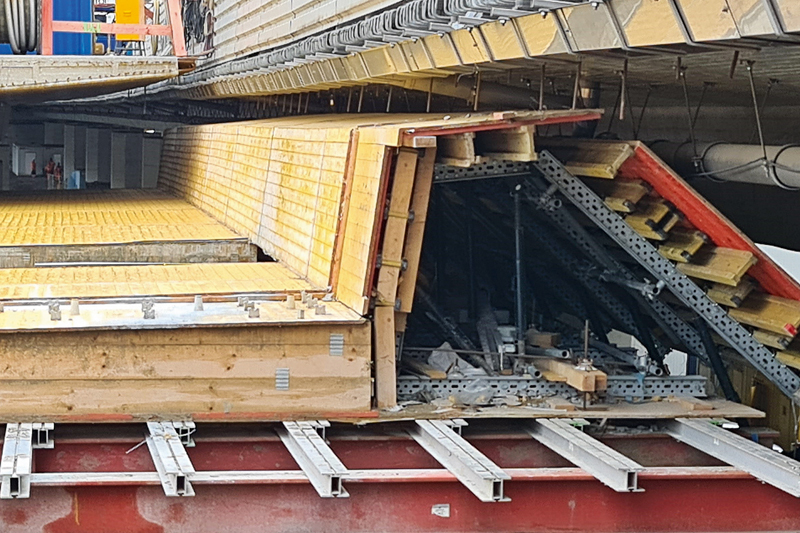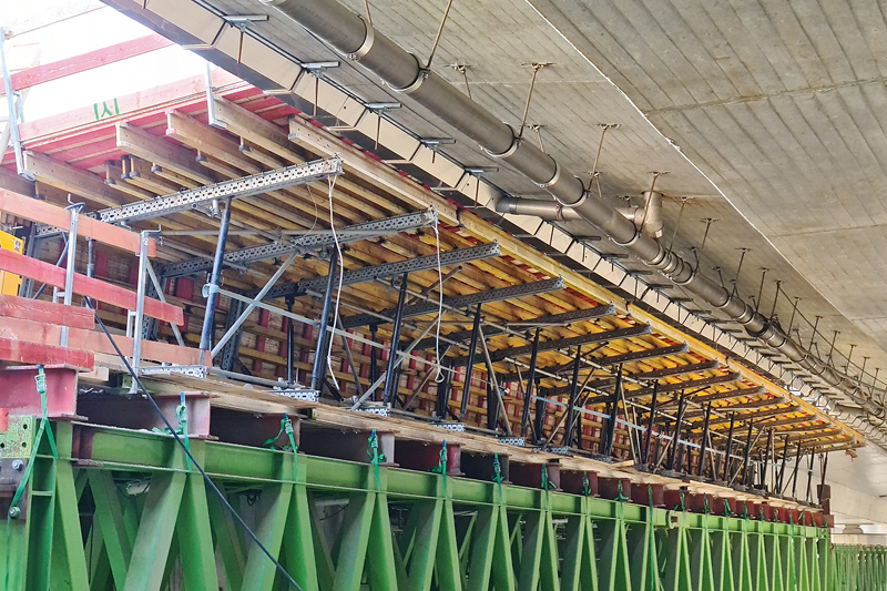 »Nach Aushärten des Betons und Spannen der Längsspannglieder wurde das Traggerüst zusammen mit der Schalung zunächst hydraulisch abgesenkt und die gesamte Schalungskonstruktion inklusive des Traggerüstes in den äußeren Bereichen des Plattenquerschnitts nach außen verschoben. So konnte das Gesperre mitsamt des Traggerüstes die Brückenpfeiler passieren«, erläutert Oliver Grote, Sales-Manager von ULMA das Vorgehen. Normalerweise sei hierfür rechts und links der Brückenkonstruktion ausreichend Platz vorhanden. Doch in Volmarstein grenzt das zweite Teilbauwerk unmittelbar an das bereits errichtete. »Hätte man das Gesperre hier nach außen verschoben, wäre es an die benachbarte Brücke gestoßen. Daher war hier eine flexible und abklappbare Lösung gefragt«, ergänzt Grote. Der ideale Anwendungsfall für das MK-System von ULMA.