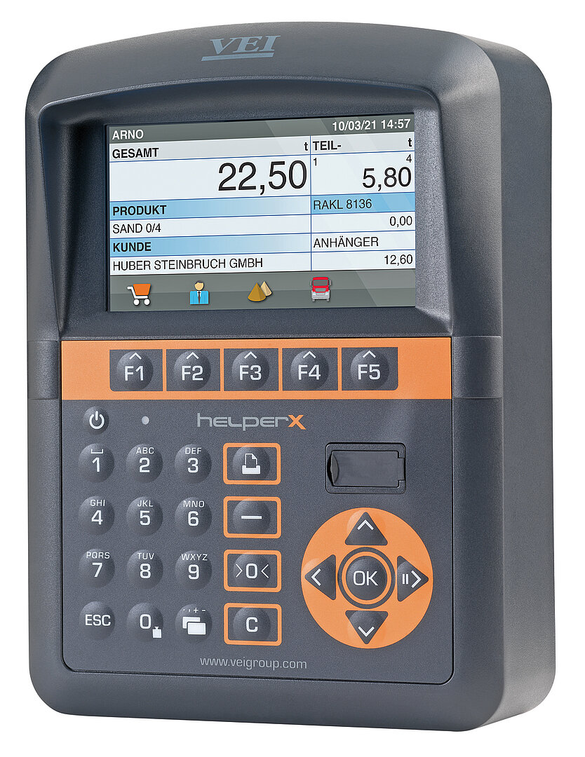 Unabhängig vom Modell lassen sich alle wichtigen Ladedaten ohne Einschränkung des Sichtfeldes auch bei starker Sonneneinstrahlung ablesen. Hervorzuheben ist außerdem, dass VEI ganz bewusst auf den Einsatz von Touchscreens verzichtet: »Fragen Sie mal einen Radlader-Fahrer, wie zuverlässig Touchdisplays funktionieren, wenn er unter Zeitdruck steht, Handschuhe trägt oder aus Sicherheitsgründen nicht andauernd auf das Display schauen kann. Hektisches Herumwischen auf dem Display lenkt beim Fahren und Beladen ab und sorgt dafür, dass das System den gewünschten Befehl nicht erkennt. Das nervt nicht nur, sondern kann auch schnell gefährlich werden«, so Volker Augustin. Stattdessen setzen die Helper-Modelle auf eine haptische Tastatur, wodurch der Bediener das Gerät über bloßes Ertasten quasi blind bedienen kann. Hinzu kommt eine enorme Funktionsvielfalt: Wenn beispielsweise eine bestimmte Materialsorte in großen Mengen zu einer vordefinierten Stelle gefahren werden soll, kann der Maschinist diesen Vorgang als Favoriten im System hinterlegen – dann ist nur noch ein einziger Tastendruck notwendig. Darüber hinaus bietet sich mit »ipotweb« eine zusätzliche Cloudlösung, die über die VEI-Geräte genutzt werden kann. So lassen sich Aufträge im Büro anlegen und automatisch an die Maschine übermitteln. Fährt dann der nächste Lkw auf den Hof, muss der Fahrer den zugehörigen Auftrag nur noch im System suchen und kann anschließend alle wichtigen Auftragsinformationen auf dem Display ablesen. Bei Bedarf, so VEI, wird auch das zu ladende Gewicht übertragen, sodass die Waage das Zielgewicht anzeigt und von diesem auf null herunterzählt. Nach dem Ladespiel wird der erledigte Auftrag dann an die Cloud übermittelt. Ein großer Vorteil: Egal ob im Radlader oder im Büro – jeder im Unternehmen kann den Auftragsstatus direkt ermitteln, was unerledigte oder gar doppelte Bearbeitungen im laufenden Arbeitsprozess gezielt ausschließt. Zusätzlich bietet die »HelperX«-Variante eine Statistikfunktion, mit der sich die verladenen Produkte eines frei wählbaren Zeitraums ausdrucken lassen. Eine weitere, laut VEI extrem hilfreiche Funktion ist im Übrigen das Anlegen von Rezepten: Müssen verschiedene Materialien gemischt werden, kann der Anwender die Zutaten bzw. Zuschlagstoffe entweder in absoluten Gewichtswerten oder bei Bedarf in Prozenten eingeben. »Die Abarbeitung kann sowohl manuell als auch vollautomatisch erfolgen – wenn eine Sorte komplett verwogen wurde, wird einfach auf die nächste Bedarfssorte umgeschaltet. Möglich ist aber auch, nach jedem Ladespiel auf das nächste Material zu wechseln, wodurch eine weit bessere Vormischung erfolgt«, so Volker Augustin abschließend.d
