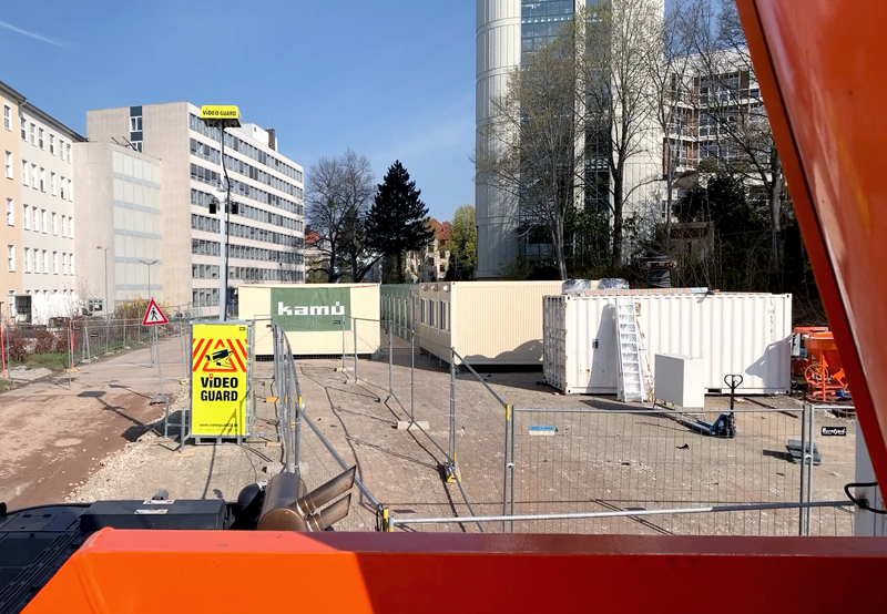 Die Baustellenbewachung übernimmt das Überwachungssystem Video Guard Professional. Insbesondere nach Feierabend und in den Abend- und Nachtstunden ist eine lückenlose Bewachung des Geländes notwendig, um teure Baugeräte, Kraftstoff und ähnliches zu schützen. Dabei setzt das System auf eine Kombination aus leistungsfähiger Hardware und intelligenter Software sowie eine personell besetzte Leitstelle. Die Überwachungstürme sind mit drei Kameras ausgestattet, die mit unterschiedlichen Öffnungswinkeln arbeiten. Die eingesetzte Technik kann zudem Einbrecher von beispielsweise Tieren unterscheiden. Fehlalarme werden so verhindert. Die an den ausfahrbaren Masten installierten Scheinwerfer nutzen nahes Infrarot (NIR), das vom menschlichen Auge nicht wahrgenommen wird. Das Licht wirkt somit nicht störend. Auf dem Baugelände stehen derzeit drei Kameratürme in den abschreckenden Signalfarben. Sollten sich Eindringlinge nicht von der auffälligen Kamerabewachung abhalten lassen, löst das System einen Alarm aus – die personell besetzte Zentrale sichtet das Videomaterial und kann sich über die am Kameraturm integrierte Lautsprecher in das Geschehen einschalten. Meist sorgt die direkte Ansprache für einen unmittelbaren Rückzug. Ist dies nicht der Fall, kann die Polizei hinzugezogen werden. Die Reaktionskette ist hier somit sehr kurz. Mit seiner flexiblen und unkomplizierten Installation kann das System ständig an den aktuellen Bauprozess angepasst werden. Das mehrjährige Wohnbauprojekt kann so problemlos dauerhaft und effizient gesichert werden. Die ersten Fertigstellungen sind für 2022 geplant.