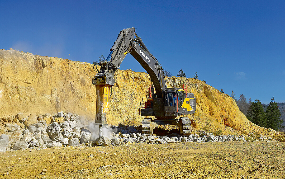 Mit der Einführung des Volvo-Baggers hat sich die tägliche Arbeit im Steinbruch grundlegend verändert. Wo zuvor große Steinbrocken nach der Sprengung mühsam per Radlader aussortiert und wochenlang zwischengelagert werden mussten, um später durch einen externen Dienstleister zerkleinert zu werden, übernehme der »EC530E« heute diese Aufgabe direkt vor Ort – und das deutlich schneller und effizienter. Technischer Betriebsleiter Maximilian Spieß beschreibt die Vorteile: »Mit dem neuen Bagger können wir nicht nur den gesamten Sprengschuss direkt verarbeiten, sondern gleichzeitig auch unsere Anlagen optimal beschicken. Der ›OilQuick‹-Schnellwechsler ermöglicht es, innerhalb kürzester Zeit zwischen Löffel und Hammer zu wechseln – das bringt uns enorme Flexibilität und steigert den Durchsatz in der Verarbeitung.« Besonders beeindruckt habe der werkseigene Volvo-Hammer »HB48«. Trotz seiner immensen Schlagkraft arbeite er erstaunlich leise. »Der Hammer ist nicht nur leistungsstark, sondern auch überraschend geräuscharm. Gerade im Außenbereich ist das ein wichtiges Argument für uns – wir wollen unsere Nachbarn so wenig wie möglich belasten«, erklärt Spieß.