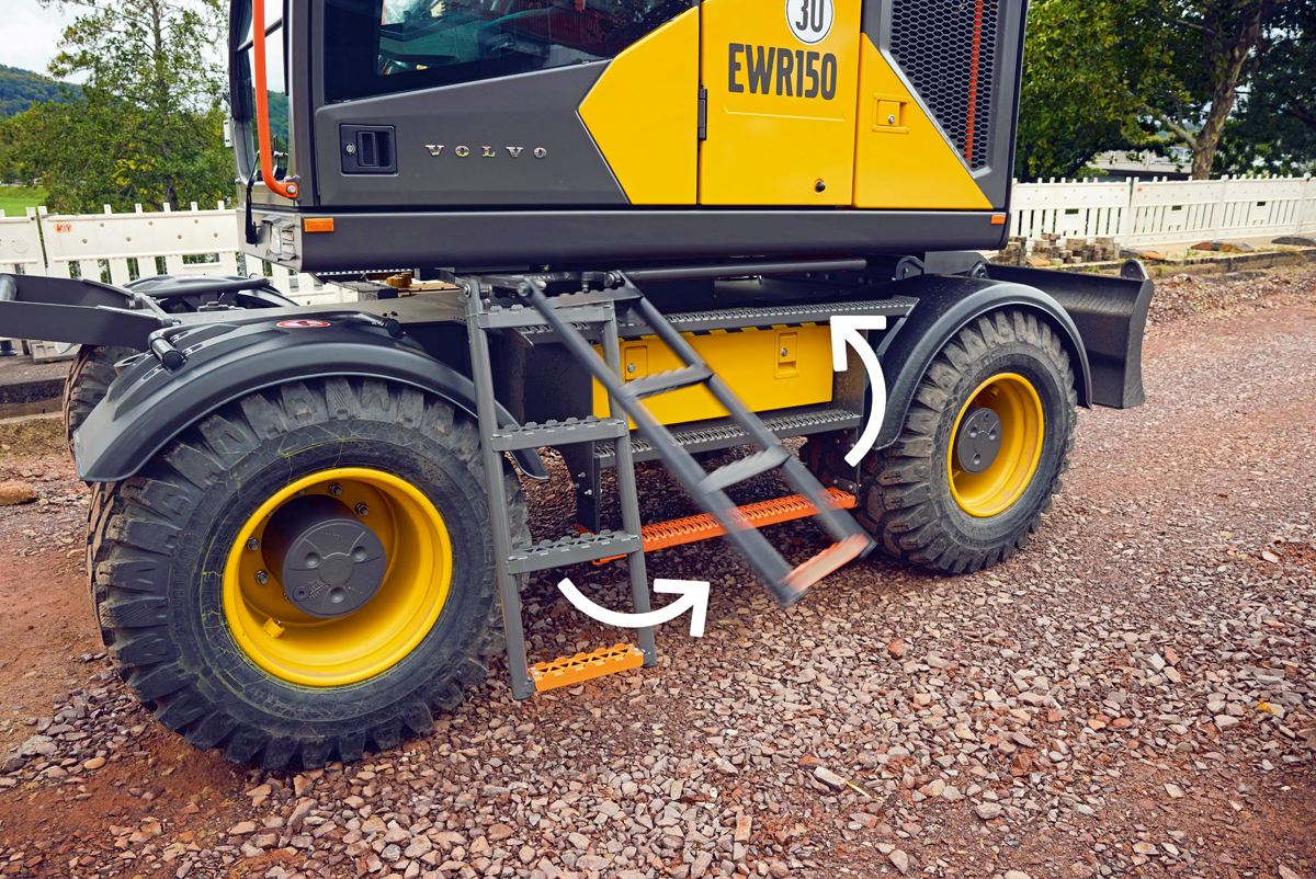 Der hohe Fahrerkomfort setzt sich mit ebensolchen Sicherheitsstandards fort. Dafür stellt die neue Komfort-Kabinentreppe ein ideales Beispiel dar: Die von Volvo patentierte, elektrisch einklappbare Leiter schwenkt aus der seitlichen Ruhestellung nach unten und ermöglicht so einen sicheren und einfachen Zugang. Für zusätzliche Sicherheit kann die Maschine bei heruntergeklappter Leiter nicht schwenken oder sich bewegen.
