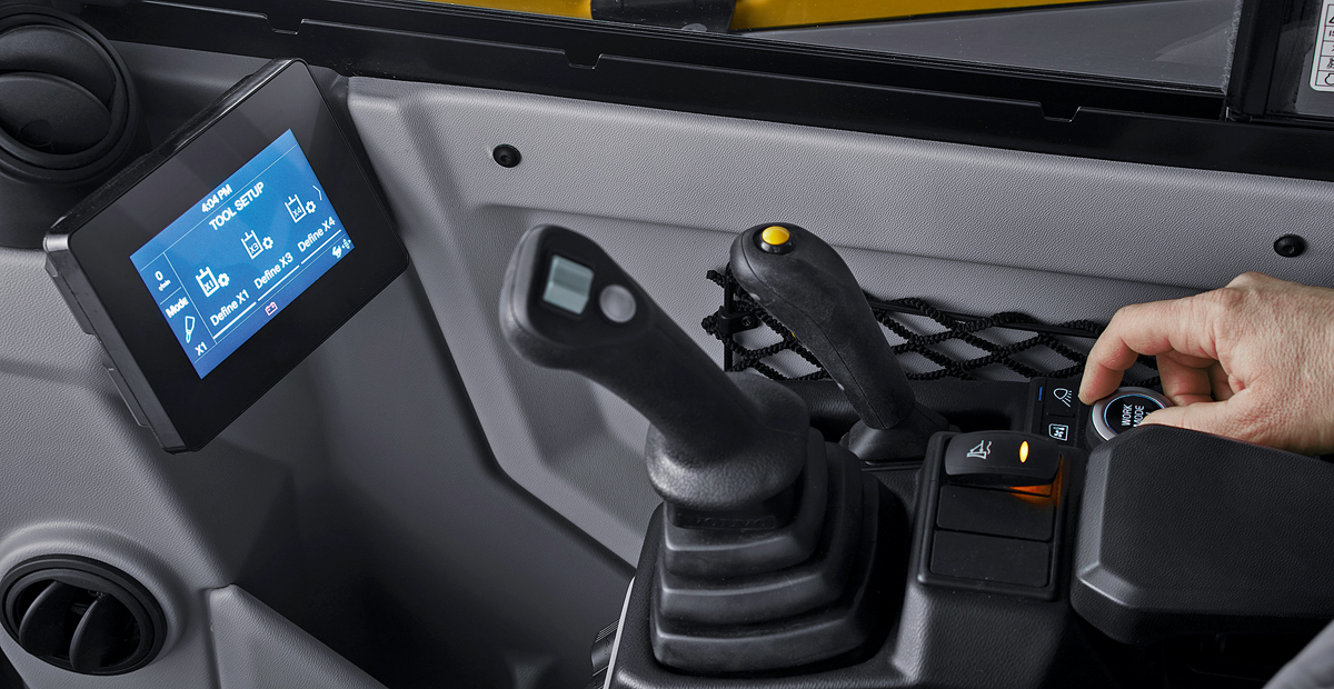 In der Fahrerkabine der beiden neuen Kompaktbagger dreht sich alles um Bedienkomfort und Design: Dank Fingertip-Steuerung, Drehrad und 5-Zoll-Farbdisplay mit einfach zu navigierenden Funktionen finden sich auch neu geschulte Bediener schnell zurecht.
