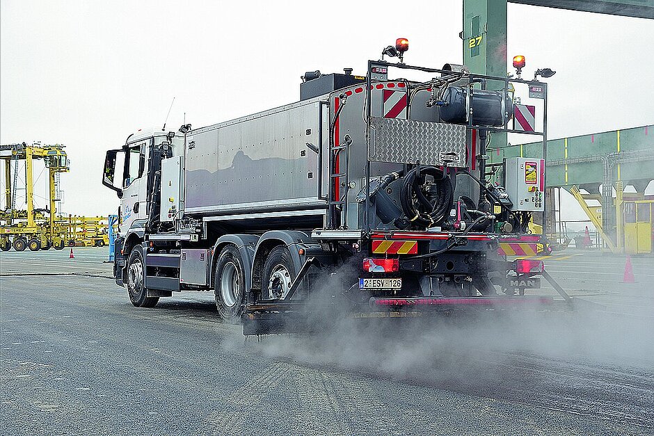 Als Nachweis der aufgetragenen Verbundschichten kann ein Protokoll auf dem bordeigenen Thermodrucker erstellt werden, zusätzlich lassen sich die Daten auch per USB-Stick auslesen und extern speichern bzw. verarbeiten. Der mitgeführte Wasservorrat kann anderen Maschinen, z. B. Walzen, zugeführt oder mittels des zusätzlich verbauten, hydraulisch betriebenen Hochdruckreinigers für Reinigungsarbeiten verwendet werden. Der Dieseltransportbehälter mit Pumpanlage und Zählwerk und optional erhältlichem Harnstoff-Modul (AdBlue) zum Betanken weiterer Baumaschinen direkt auf der Baustelle ergänzt zusätzlich die Baustellenlogistik, da eine separate Bereitstellung von Kraftstoffen entfallen kann. Angetrieben wird der Maschinenaufbau über eine am Nebenabtrieb des Lkw-Dieselmotors angeflanschte, permanent angetriebene »Load Sensing«-Verstellpumpe, die bedarfsgerecht jederzeit nur die Ölmenge fördert, die durch die Maschine benötigt wird.j